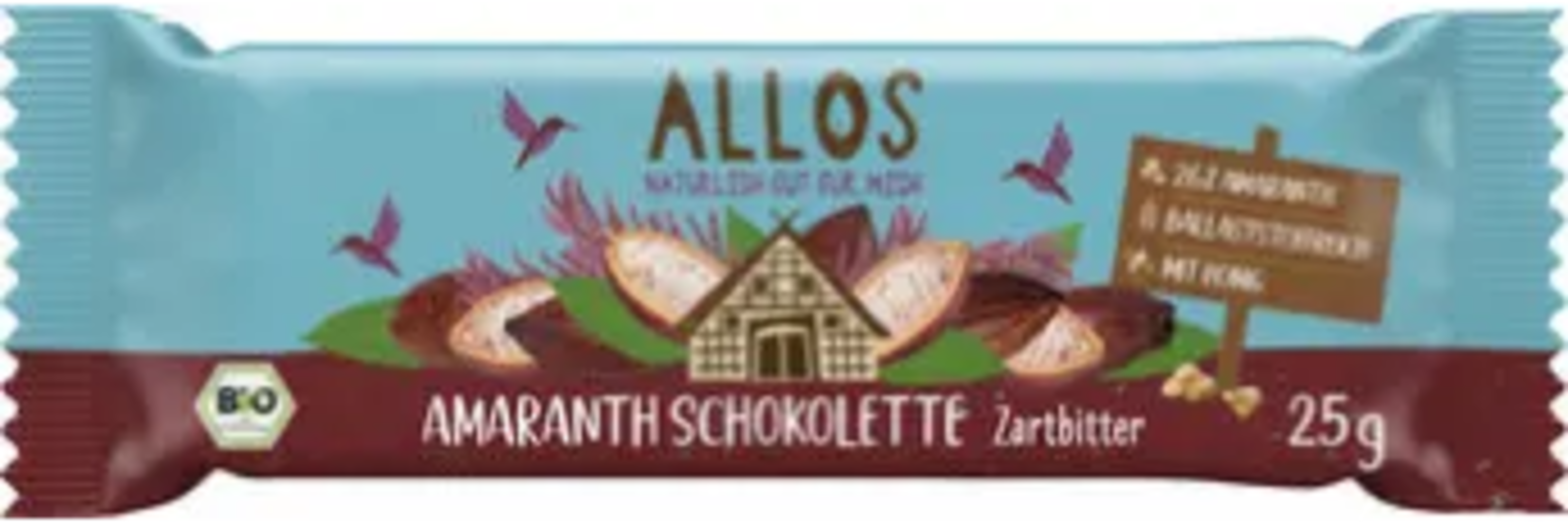 Ploščica iz ekspandiranega amaranta, v celoti oblita s hrustljavo temno čokolado. Poslastica, obogatena z medom, kot nalašč za uživanje med obroki čez dan, ali ko si zaželite nekaj sladkega. Sestavine prihajajo iz ekološke pridelave.