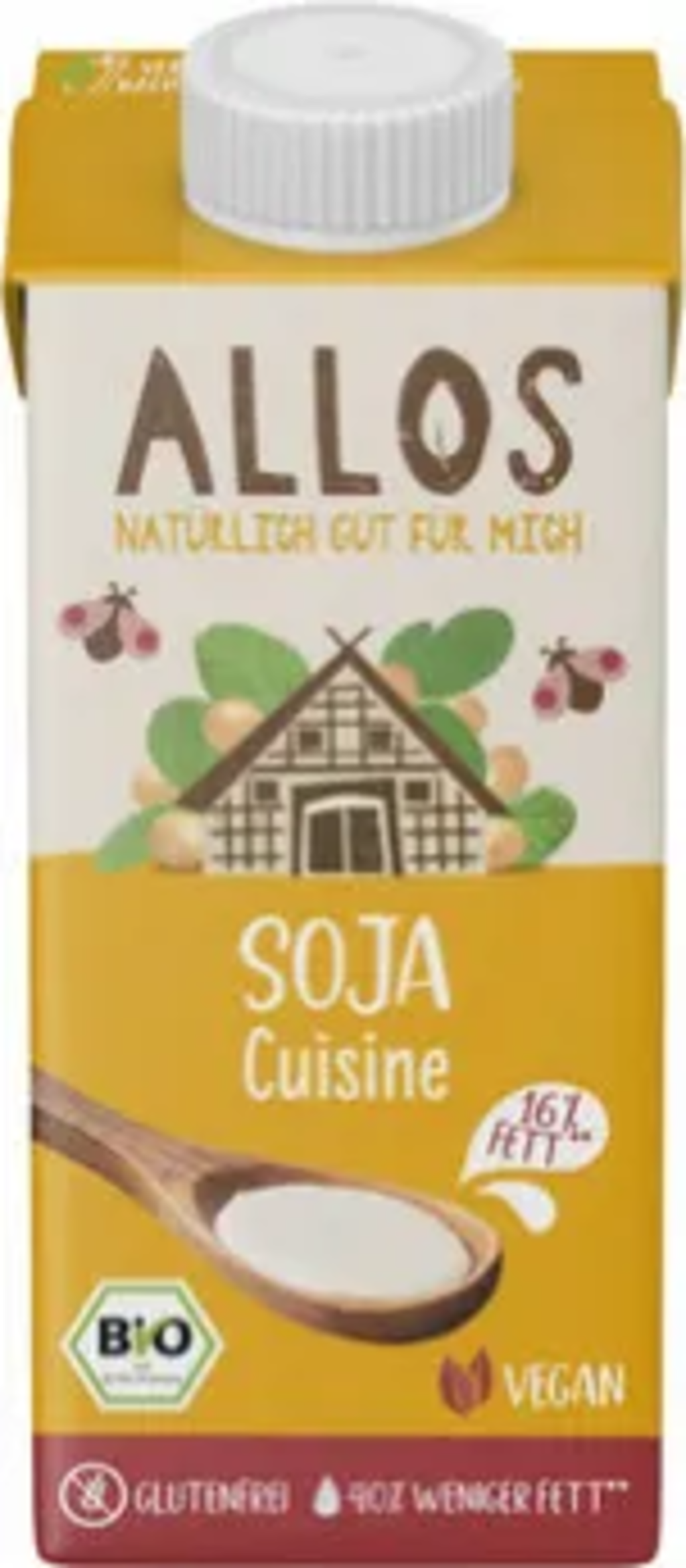 Soja namesto kravjega mleka omogoča kuhanje na rastlinski osnovi, ne da bi pri tem izgubili kremastost. Ne glede na to, ali gre za slane jedi ali sladice - z Bio Cuisine - soja znamke ALLOS lahko pričakujete popolne rezultate kuhanja. S 16 % maščobe.
