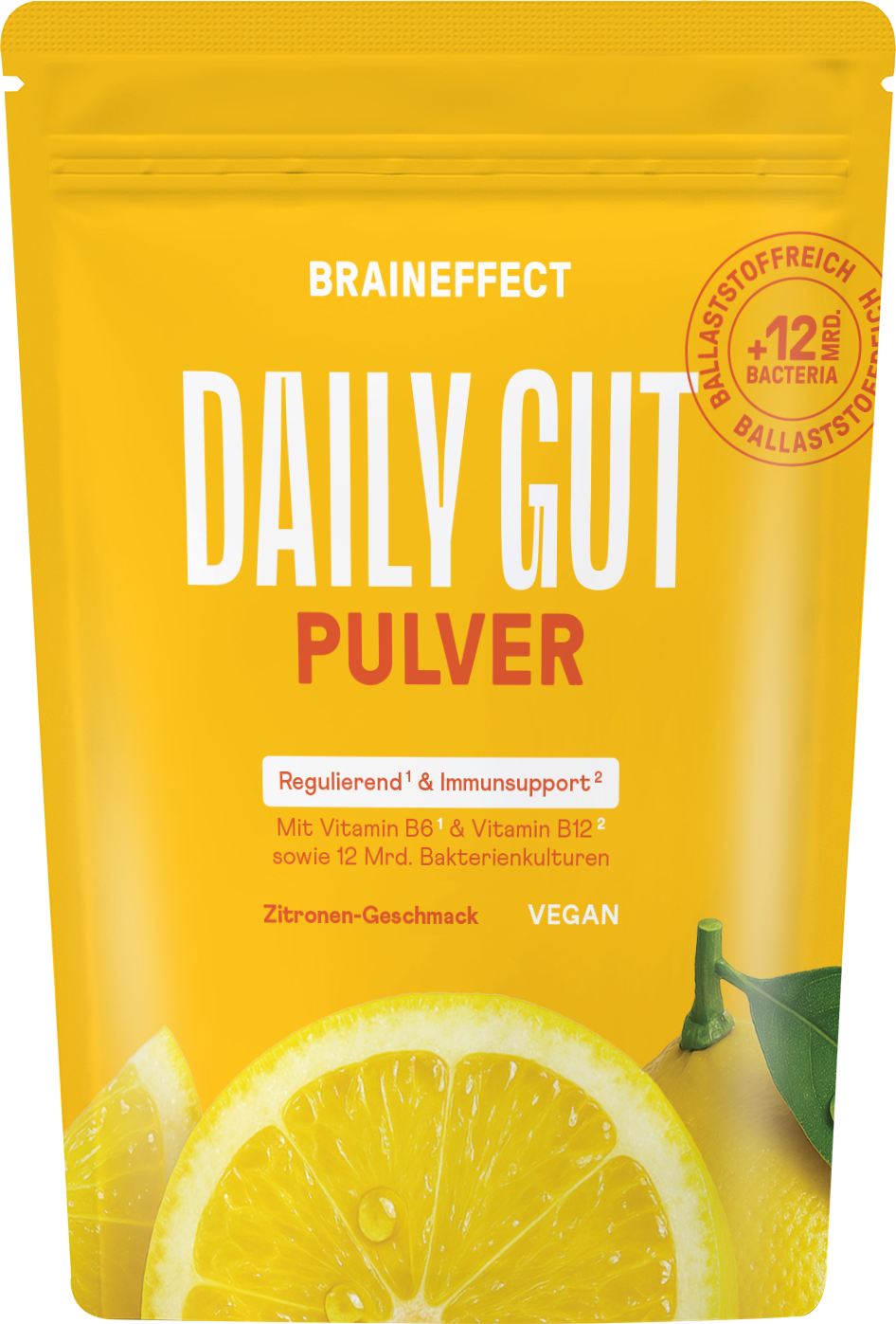 DAILY GUT v prahu znamke BRAINEFFECT se ponaša z izboljšano formulacijo v prostorsko varčni vrečki. Z 12 milijardami živih bakterijskih kultur in 6 g vlaknin na porcijo je to prehransko dopolnilo idealen spremljevalec vaše vsakodnevne prehrane. Sestava je bila zasnovana z bifido in mlečnokislinskimi bakterijami, saj se te bakterije naravno pojavljajo tudi v črevesju. Poleg tega je dopolnjena s pomembnimi vitamini, kot so B1, B6 in B12.
