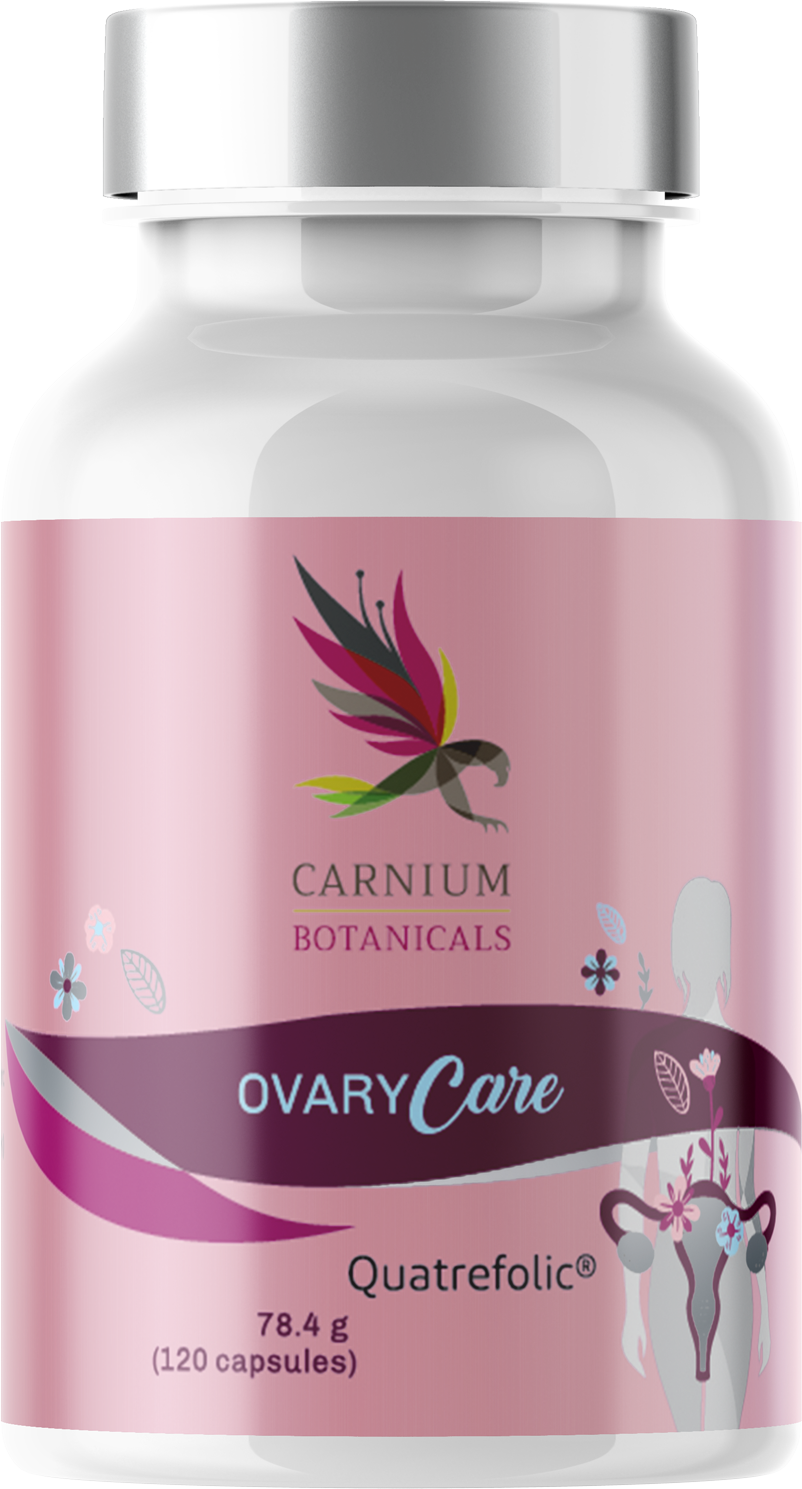 Ovary Care znamke Carnium Botanicals podpira ženske s sestavinami, kot so mio-inozitol, ingver, koencim Q10 in Quatrefolic®. Kapsule so primerne za osebe, stare 18 let in več. Formula ne vsebuje glutena, laktoze in konzervansov.