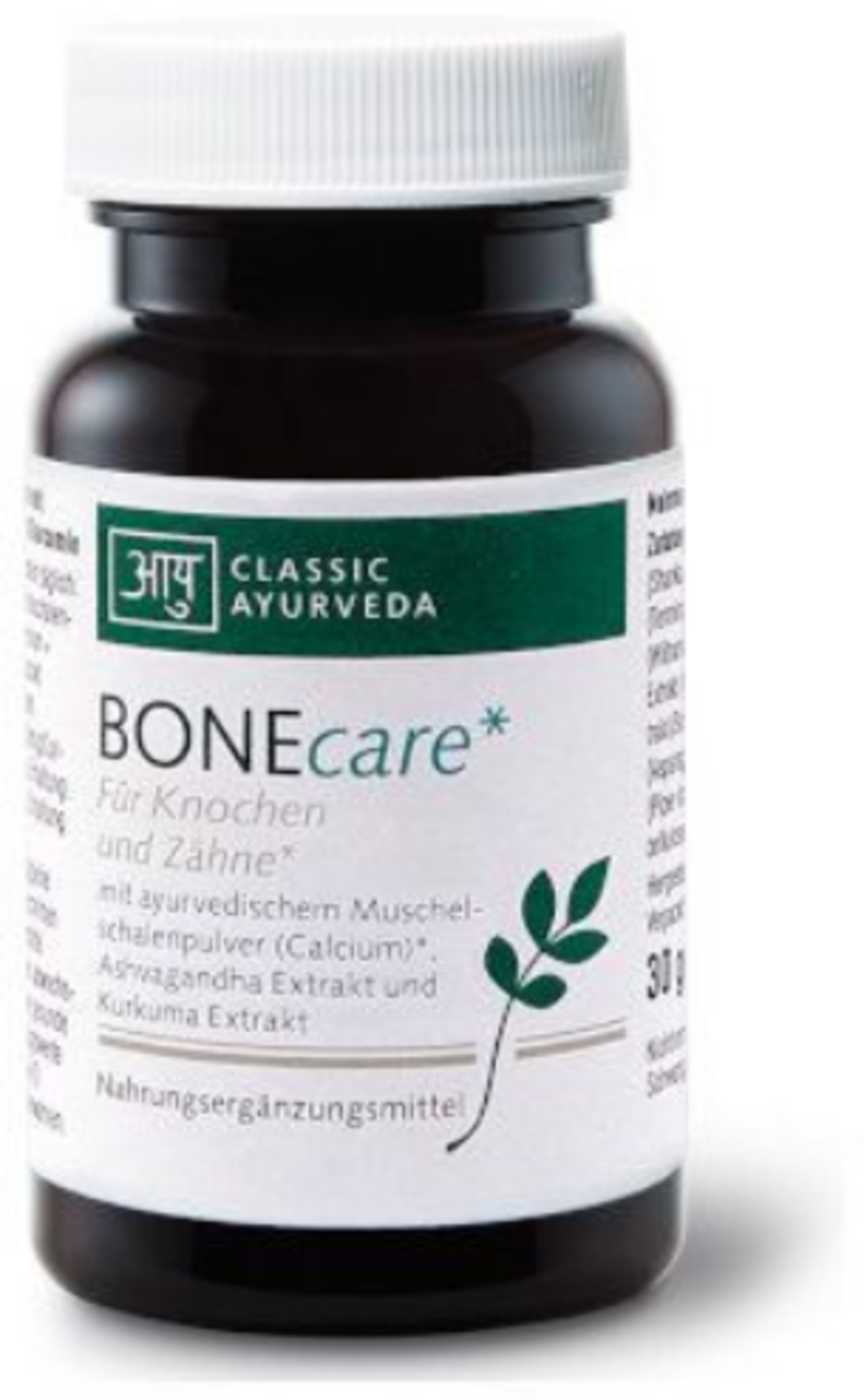 Kapsule BONEcare znamke Classic Ayurveda združujejo prah školjčnih lupin, bogat z minerali, z izbranimi rastlinskimi izvlečki. Formula vsebuje ašvagando, kurkumo, arjuno, shallaki in shatavari. Sestavo zaokrožuje mešanica začimb trikatu, ki jo sestavljajo pippali, ingver in črni poper.