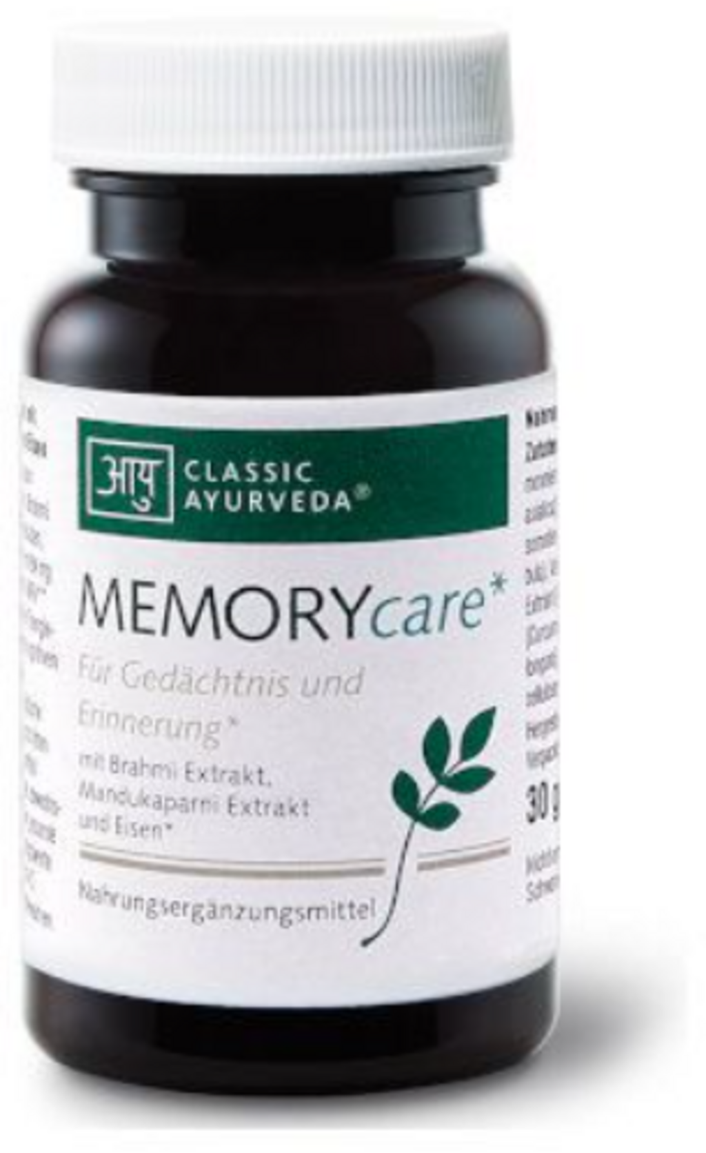 Kapsule MEMORYcare znamke Classic Ayurveda združujejo tradicionalne rastlinske izvlečke in element v sledovih železo. Formula temelji na brahmi in mandukaparni izvlečkih, ki jih dopolnjujejo ašvagandha, amla in kurkuma. Sestavo dopolnjujeta haritaki in pippali.