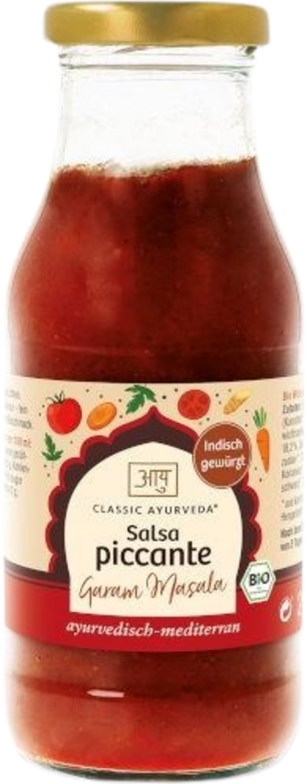 Ta ajurvedsko navdihnjena začimbna omaka znamke Classic Ayurvede združuje pasirane paradižnike in koncentrirano paradižnikovo mezgo s svežo mešanico zelenjave: korenjem, porom in zeleno. Njen edinstven značaj izhaja iz dodatka garam masale, mešanice lovorjevega lista, koriandra, grškega sena, kumine, črnega popra, ingverja, cejlonskega cimeta in janeža. Ta omaka, začinjena z belim balzamičnim kisom, trsnim sladkorjem in kameno soljo, je odlična aromatična osnova za riževe jedi, curry jedi ali testenine. Vse sestavine so ekološko pridelane.