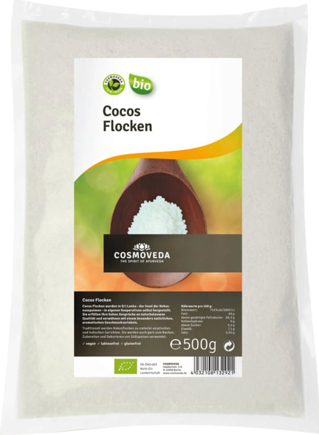 Kokosovi kosmiči COSMOVEDA so narejeni iz svežih cejlonskih kakavovih oreščkov, zaradi okusnega vonja in vabljivega okusa pa ga pogosto uživamo kot prigrizek ali uporabimo za kuhanje in peko.