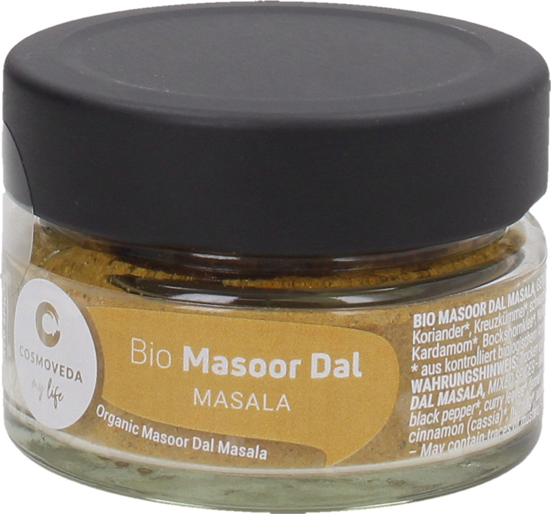 COSMOVEDA BIO masoor dal masala specialno uravnotežena ayurvedska mešanica skrbno izbranih začimb za pripravo oksunega in lahko prebavljivega masoor dala.