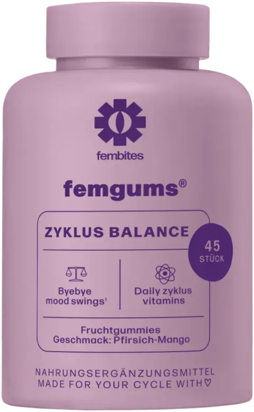 femgums® CYCLE BALANCE sadni gumijasti bonboni so posebej zasnovani za zadovoljevanje prehranskih potreb žensk – naravni, okusni in brez umetnih dodatkov. Razviti so bili v sodelovanju z nutricionisti in ginekologi ter vsebujejo optimalno kombinacijo 13 vitaminov in mineralov, ki temeljijo na študijah, v optimalni kombinaciji.