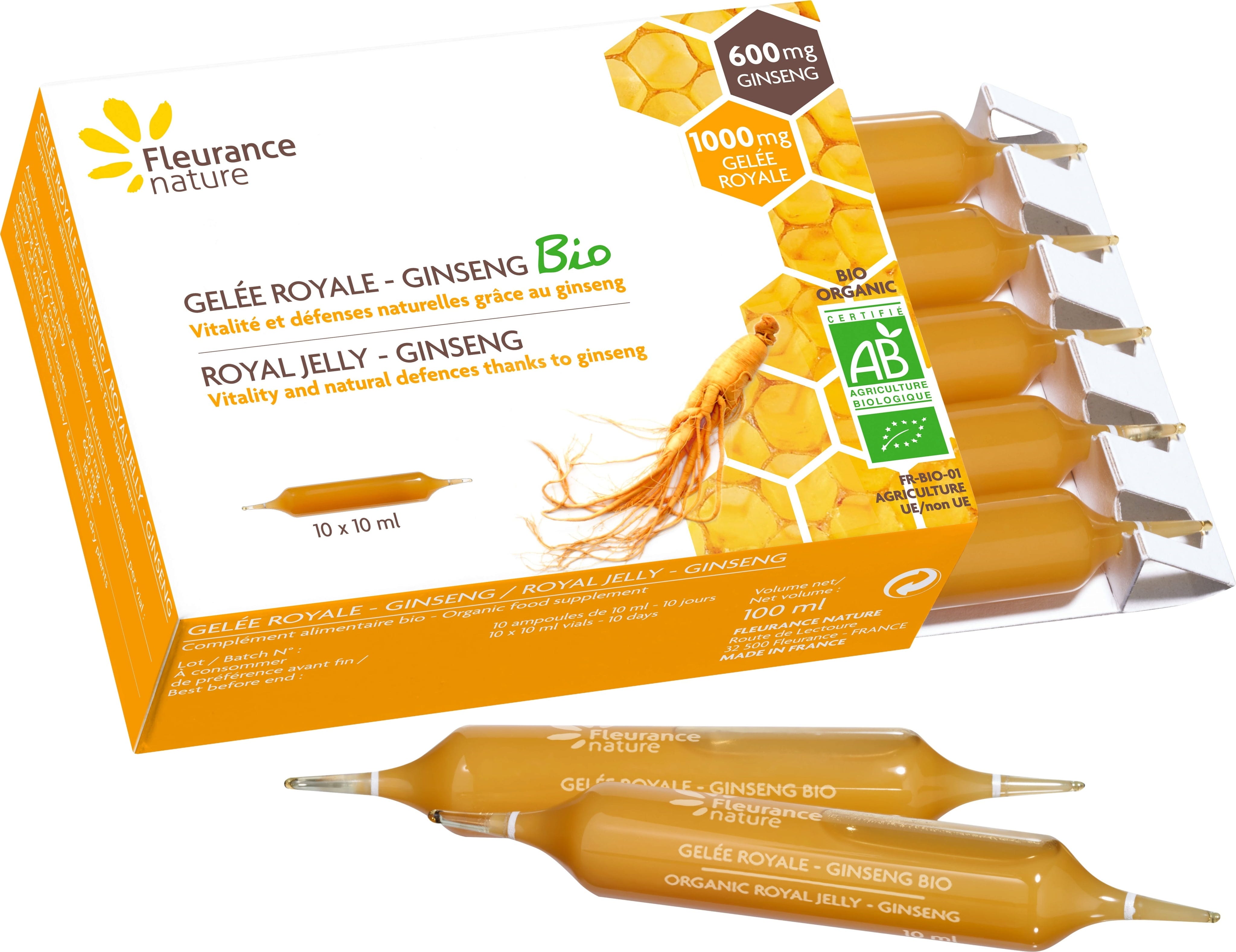 Fleurance Nature Matični mleček z ginsengom, bio, 10 ampul.