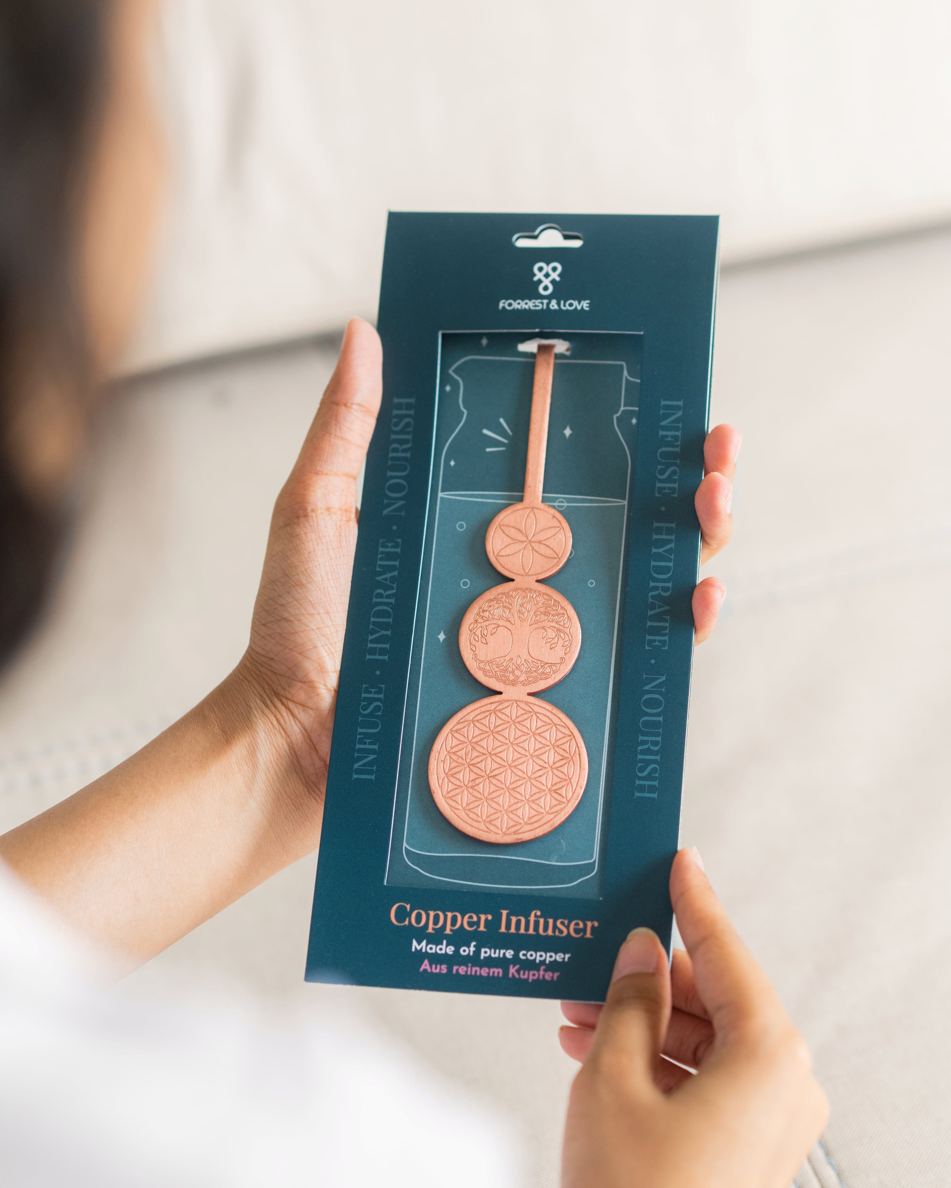 V ajurvedi je obdelava z bakrom že stoletja star običaj. Voda postane naravno alkalna in pH vrednost se nevtralizira. To pripelje tri doše (Vata, Kapha in Pitta) - imenovane tudi "Tamara Jan" - v ravnovesje lepega in zdravega telesa. Praktičen in skrbno izdelan infuzer podjetja FORREST & LOVE lahko uporabite na skoraj vsakem kozarcu za vodo in v celoti lahko uživate v vitalno osvežilni in svilnato mehki bakreni vodi! Eleganten dizajn skupaj z doživljenjsko vzdržljivostjo prepriča z varčevanjem z viri, trajnostno in pošteno proizvodnjo.