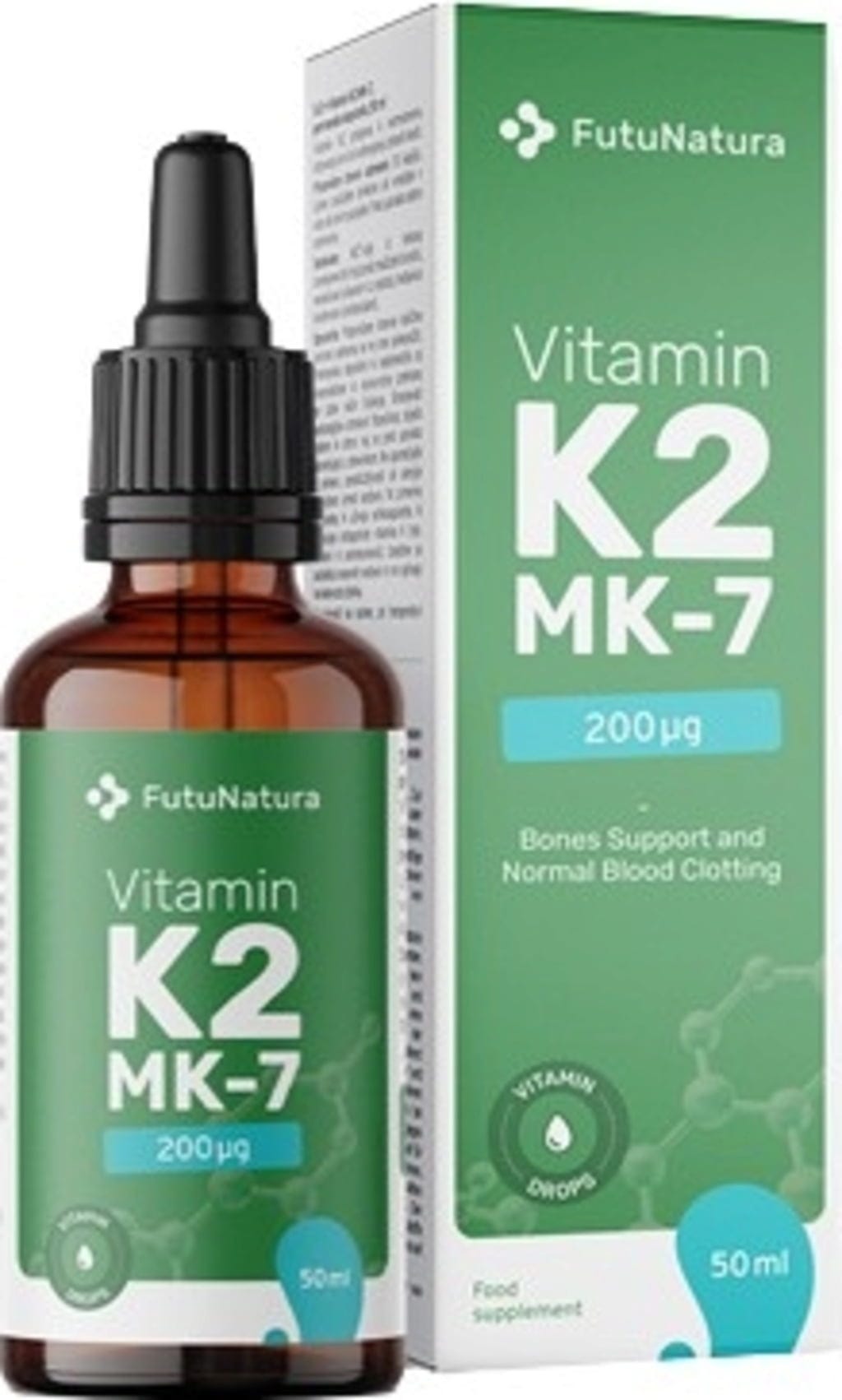 Vitamin K2 MK-7 200 µg znamke FutuNatura je pridobljen iz fermentirane soje, Nattō. Vsebuje menakinon-7 (MK-7), obliko vitamina K2. Kapljice so obogatene tudi z MCT kokosovim oljem. Priročna steklenička s kapalko omogoča enostavno odmerjanje in uporabo.