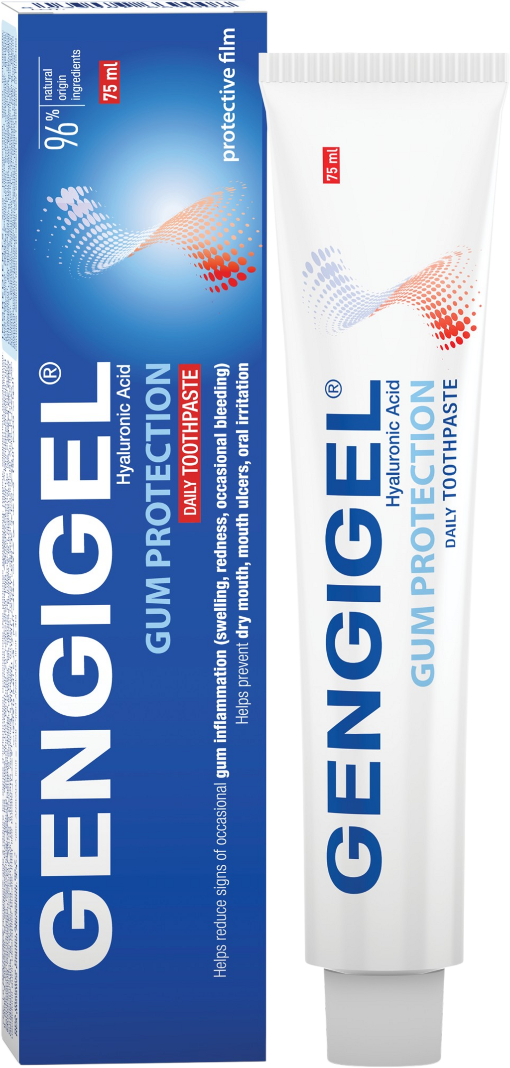 Zobna pasta znamke Gengigel ponuja specializirano rešitev za vsakodnevno ustno higieno. Formula temelji na patentirani mukoadhezivni formuli, ki na dlesnih tvori dolgotrajen zaščitni film. Z uporabo hialuronske kisline, ki je podobna telesu lastni snovi v ustni sluznici, se tkivo neguje ob vsakem ščetkanju. Cilj kombinacije sestavin je zaščititi dlesni in okrepiti sklenino. Zaradi prijetnega, rahlo slanega okusa in odsotnosti sestavin, kot je SLS, je namenjena dolgotrajni uporabi. Tekstura slonokoščene barve je idealna za vključitev v vašo obstoječo rutino.