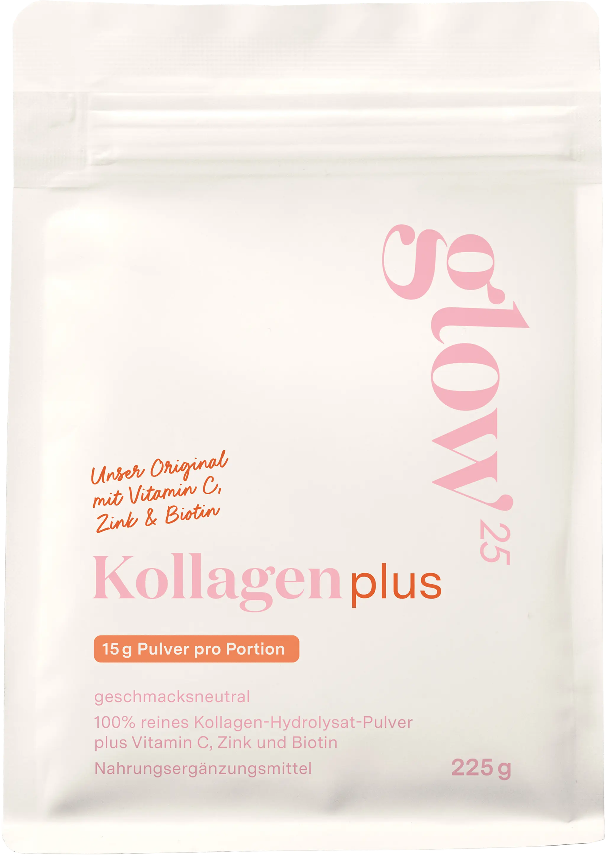 Glow25 Collagen Plus združuje visokokakovosten kolagen hidrolizat z vitaminom C, cinkom in biotinom. Prašek brez okusa se lahko enostavno vmeša v hladne in tople napitke ali hrano – idealno za vsakodnevno uporabo.