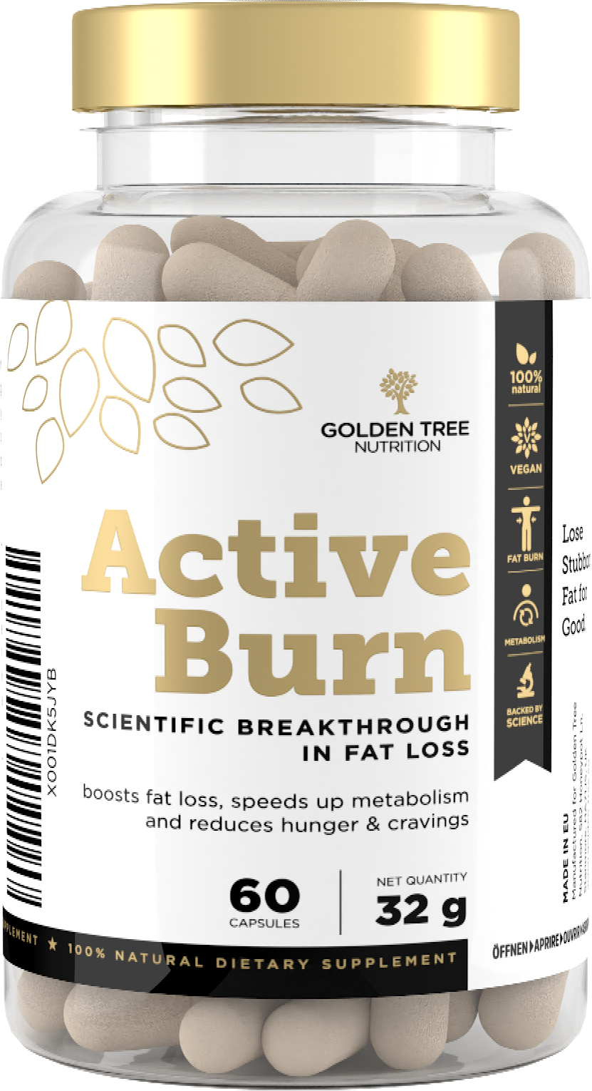 Active Burn znamke Golden Tree je termogeni izdelek, ki združuje osem visokokakovostnih aktivnih sestavin. Veganska formula je sestavljena iz izbranih rastlinskih izvlečkov, pomembnih vitaminov in esencialnih elementov v sledovih.