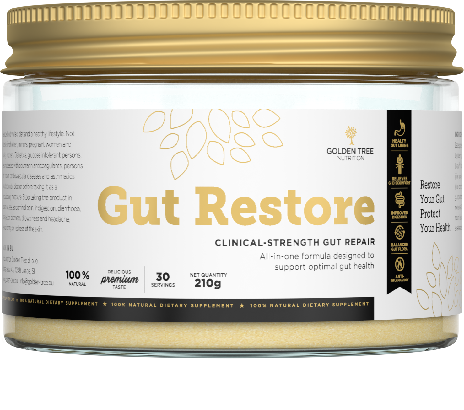 Gut Restore znamke Golden Tree ponuja optimalno sestavo 10 naravnih sestavin. To mešanico prebiotikov, prebavnih encimov, aminokislin in rastlinskih izvlečkov preprosto vmešate v tekočino po vaši izbiri, zaradi česar je to prehransko dopolnilo enostavno vključiti v vašo vsakodnevno rutino.
