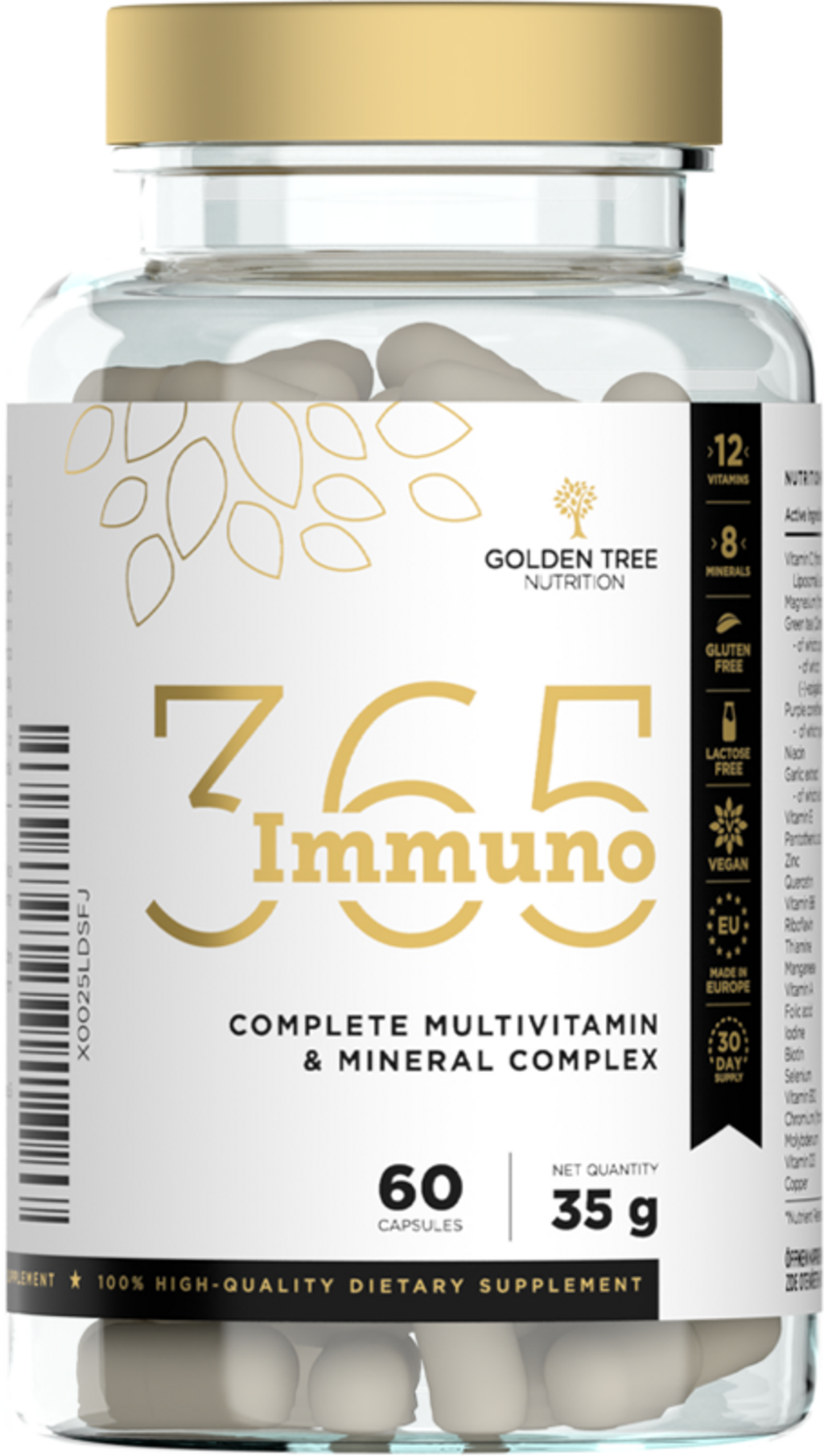 Immuno365 znamke Golden Tree je multivitaminski kompleks, obogaten z izbranimi minerali in rastlinskimi izvlečki. Z Immuno365 poskrbite, da je vaše telo vsak dan optimalno oskrbljeno z najpomembnejšimi vitamini in minerali.