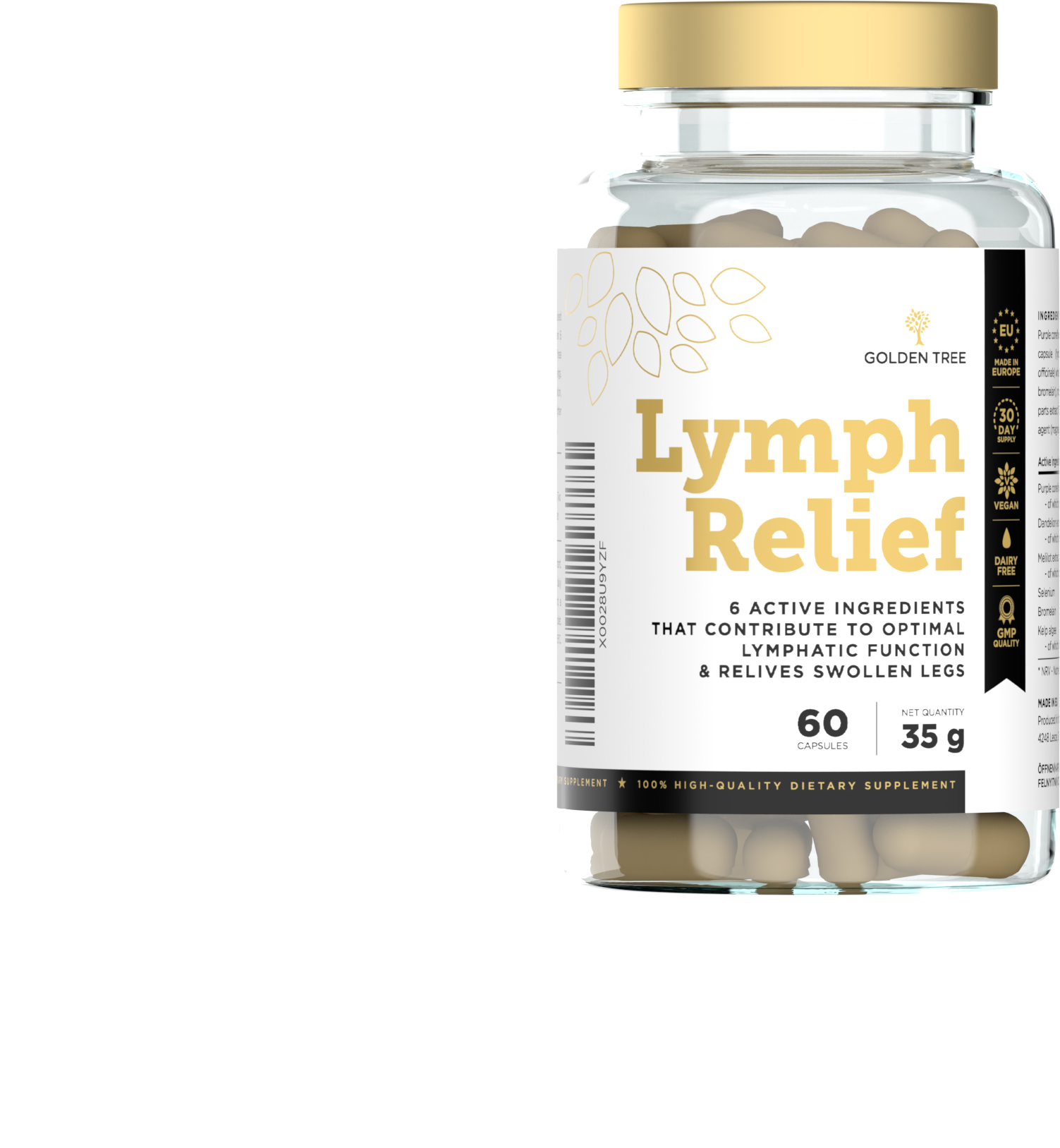 Lymph Relief znamke Golden Tree je kombinacija visokokakovostnih rastlinskih izvlečkov, ki so dopolnjeni z algami kelp in selenom. Skrbno oblikovana formula je primerna tudi za vegansko prehrano.