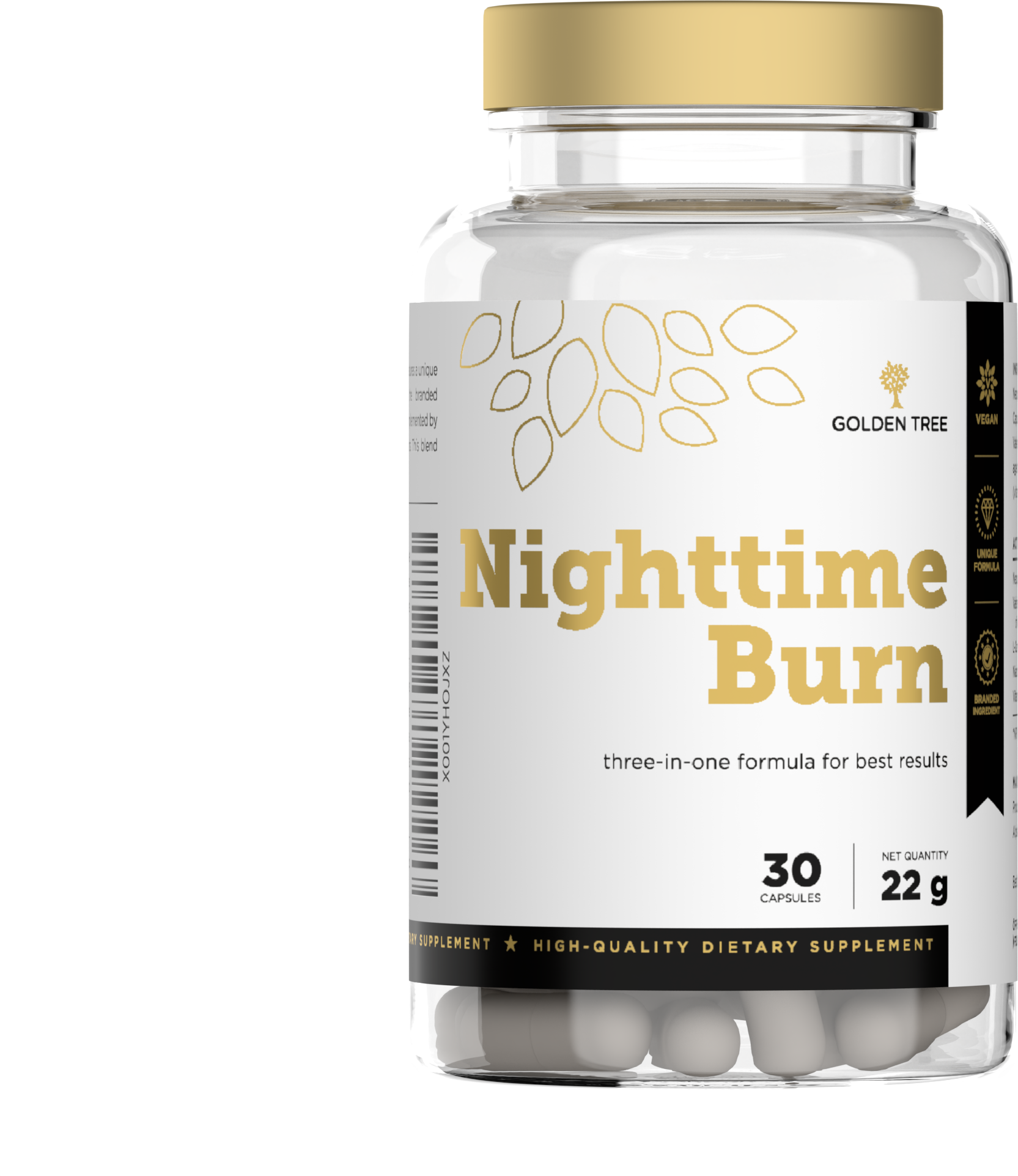 Nighttime Burn znamke Golden Tree je sestavljen iz treh glavnih sestavin. L-karnitin je vitaminu podobna snov in pomembna sestavina energijskega metabolizma. Izvleček korenine baldrijana se v tradicionalni medicini uporablja že stoletja. Izvleček opuncije je bogat z dragocenimi hranili. Veganska formula je dopolnjena tudi z vitaminoma B6 in B3.
