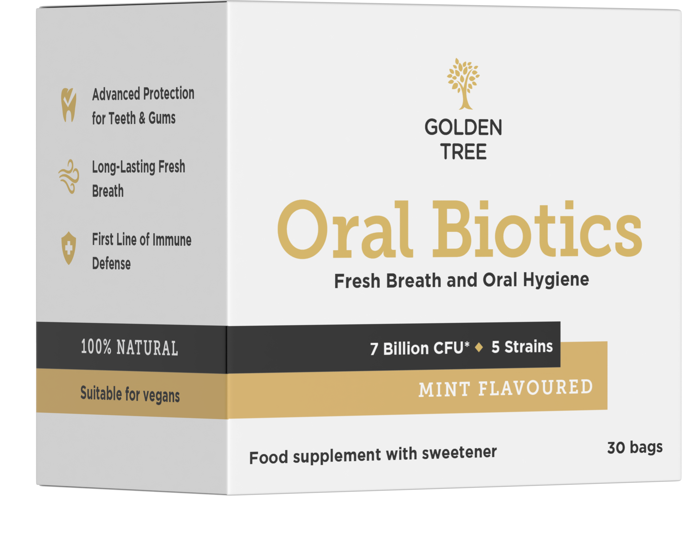 Oral Biotics znamke Golden Tree združuje 5 različnih bakterijskih sevov, ki vam pomagajo pri zobni higieni. Prašek ima osvežujoč okus mete in je sladkan s stevio.