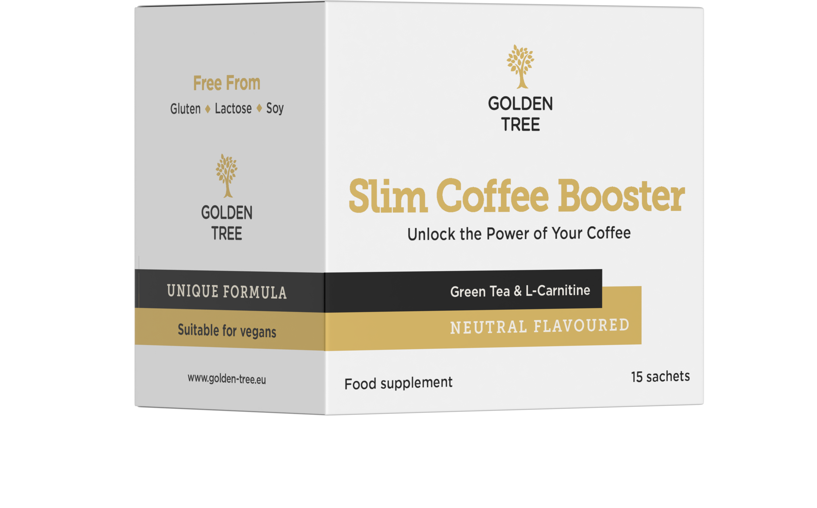Slim Coffee Booster znamke Golden Tree je prehransko dopolnilo, ki ga je še posebej enostavno zaužiti in združuje izvlečke zelenega čaja in zelenih kavnih zrn z L-karnitinom in kromovim pikolinatom. Ta mešanica okrepi vašo kavo, ne da bi pri tem vplivala na aromo, okus ali konsistenco napitka.