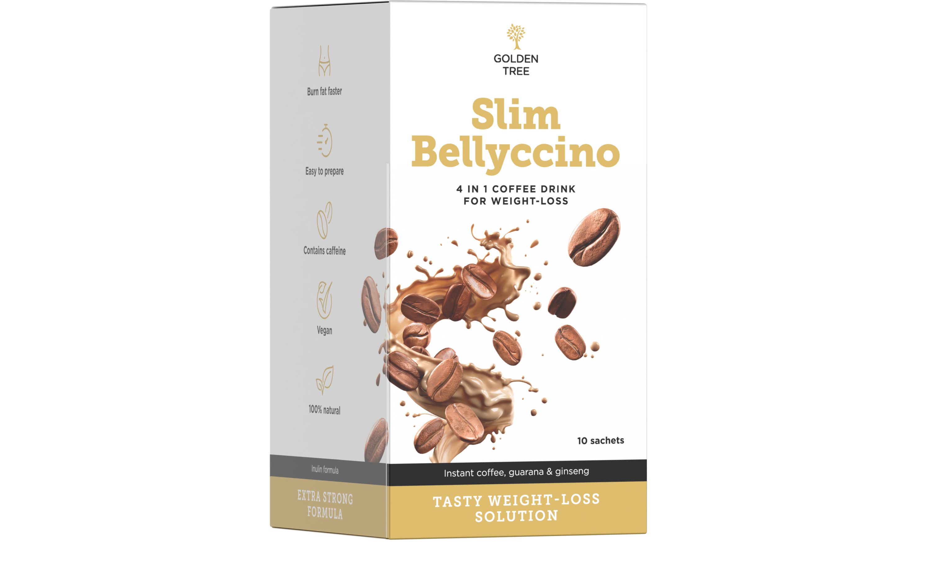 SlimBellyccino znamke Golden Tree je okusna instant kava, obogatena s tremi izbranimi zeliščnimi sestavinami. Prah korenine cikorije vsebuje prebiotični inulin, izvlečki semen guarane in sibirskega ginsenga pa vsebujejo koristne fitokemikalije. Prah se zlahka raztopi v vroči vodi in ima prijeten okus po kavi.