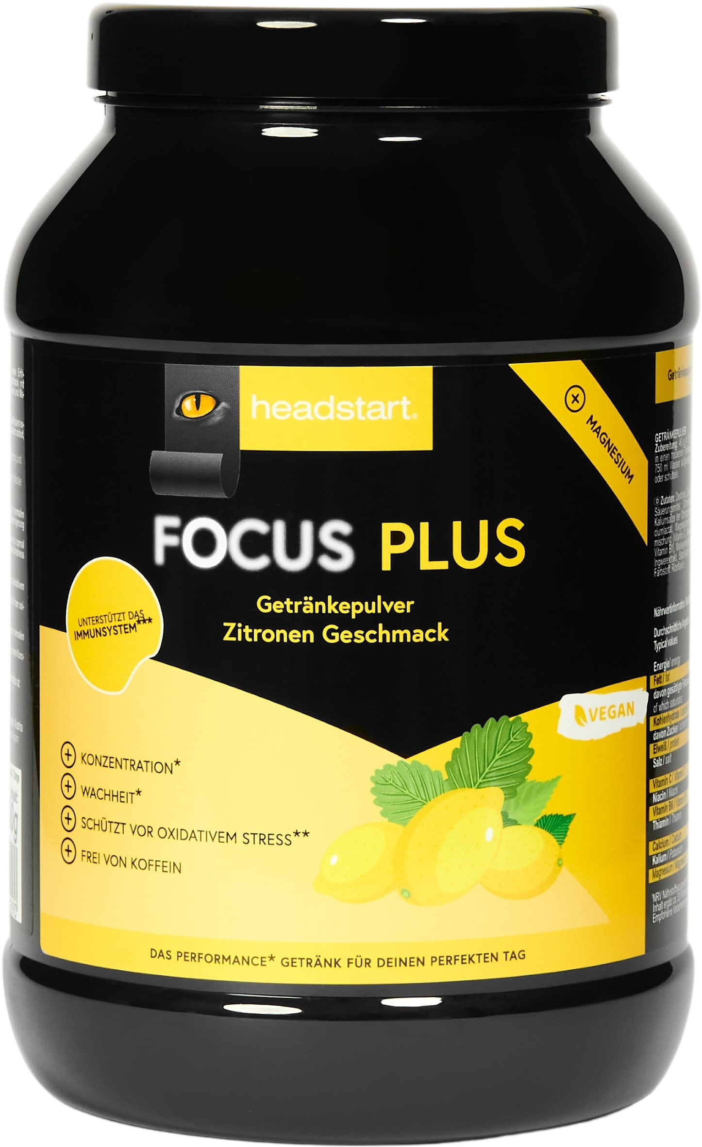 Napitek v prahu Focus Plus znamke headstart spremeni vodo v sadno osvežilno pijačo z osvežilno limono - brez umetnih barvil, arom in konzervansov. Prašek brez kofeina se zlahka raztopi v vodi in ponuja prijeten okus. Kombinacija okusa limone ter uravnotežene sestave mineralov in vitaminov ustvarja vsestranski napitek, ki ga lahko uživate na poti, v službi ali v prostem času.