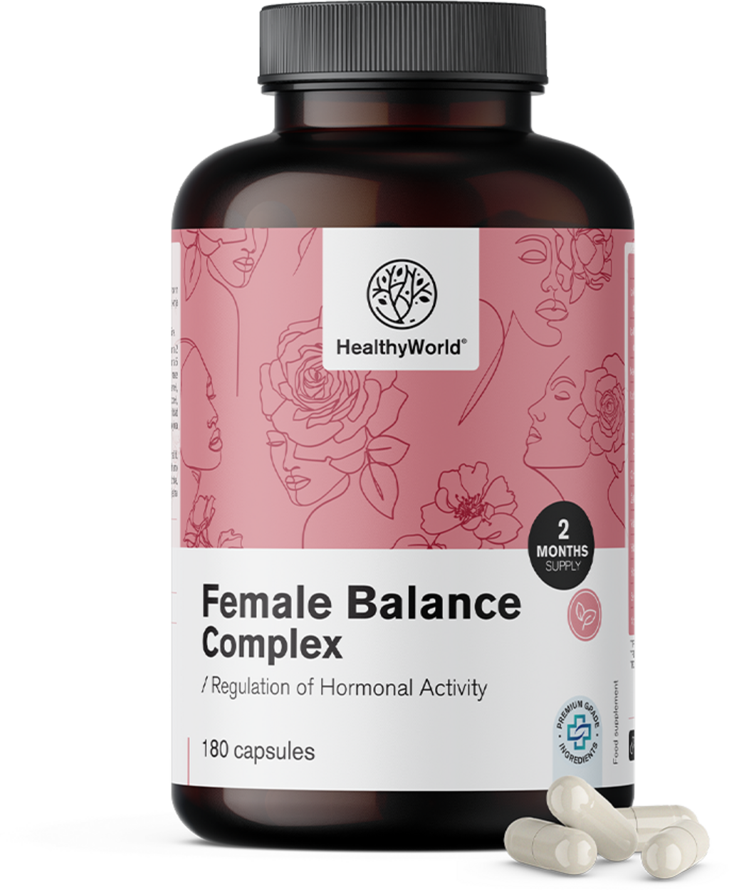 Ta izdelek je primeren za ženske vseh starosti. Te zeliščne kapsule vsebujejo šest dragocenih rastlinskih izvlečkov, vključno z izvlečki plahtice in konopljike. Vsebujejo tudi vitamine, kot sta vitamin B6 in vitamin B12. Vitamin B6 prispeva k uravnavanju hormonske aktivnosti. Poleg tega Female Balance – kompleks za ženske združuje minerale cink, selen in železo. Kapsule so enostavne za odmerjanje in jemanje.