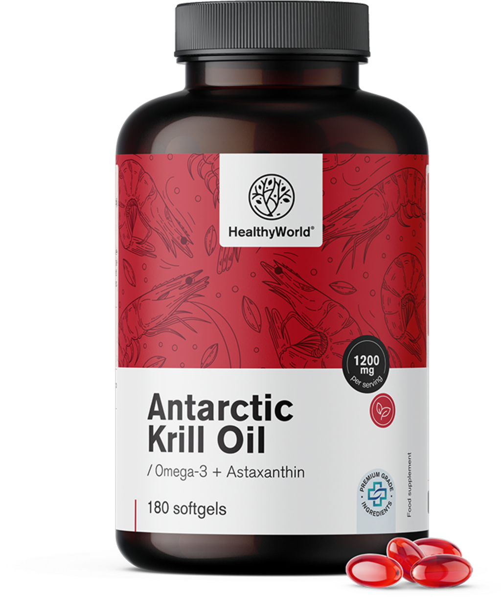 To prehransko dopolnilo na osnovi olja antarktičnega krila zagotavlja 1200 mg krilovega olja v priporočenem dnevnem odmerku (2 soft-gel kapsuli), vključno z nenasičenimi maščobnimi kislinami omega-3 EPA in DHA ter fosfolipidi, astaksantinom in holinom - vse v naravni sestavi malih morskih rakcov iz Antarktičnega oceana.