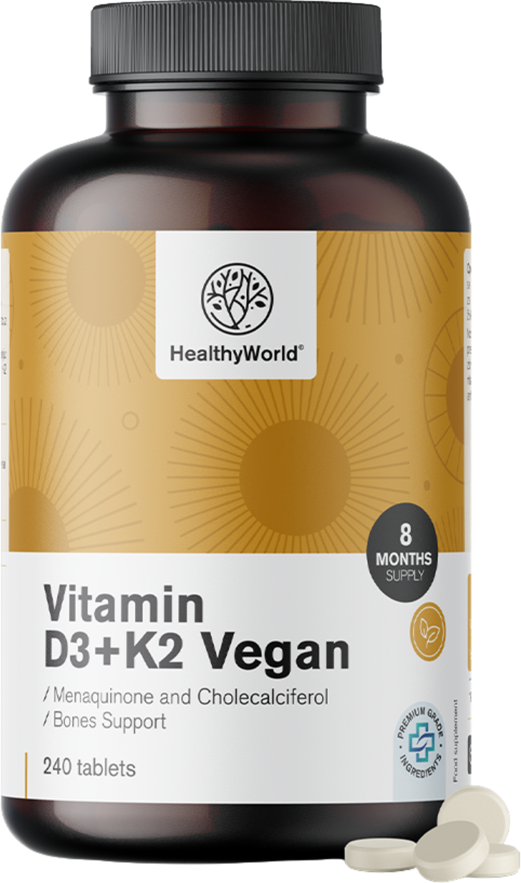 Te tablete znamke HealthyWorld združujejo dva veganska vitamina: vitamin D3 in vitamin K2. Vitamin D prispeva k ohranjanju zdravih kosti. Tablete so sestavljene izključno iz rastlinskih sestavin in jih je enostavno odmerjati.