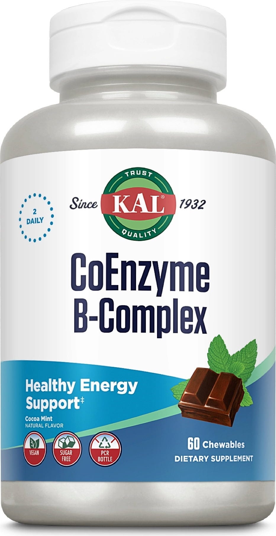 - KAL® Koencim B-kompleks Vegetarijansko je okusen, dobro doziran kompleks esencialnih vitaminov B z naravnim okusom čokolade in mete