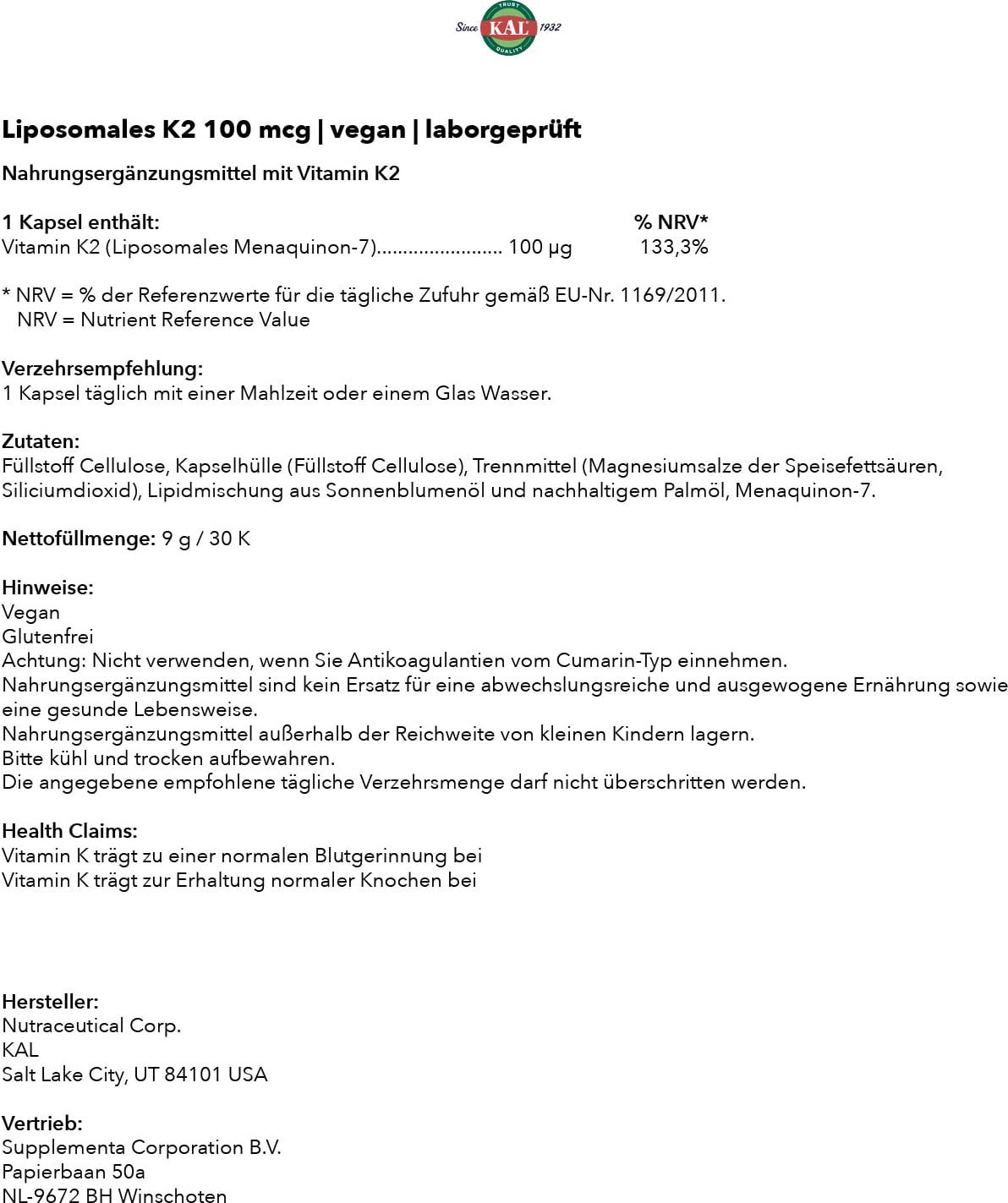 Te veganske in brezglutenske kapsule znamke KAL vsebujejo liposomski K2, ki je v maščobi topen vitamin, ki ga najdemo v nekaterih vrstah mesa in fermentiranih živil.