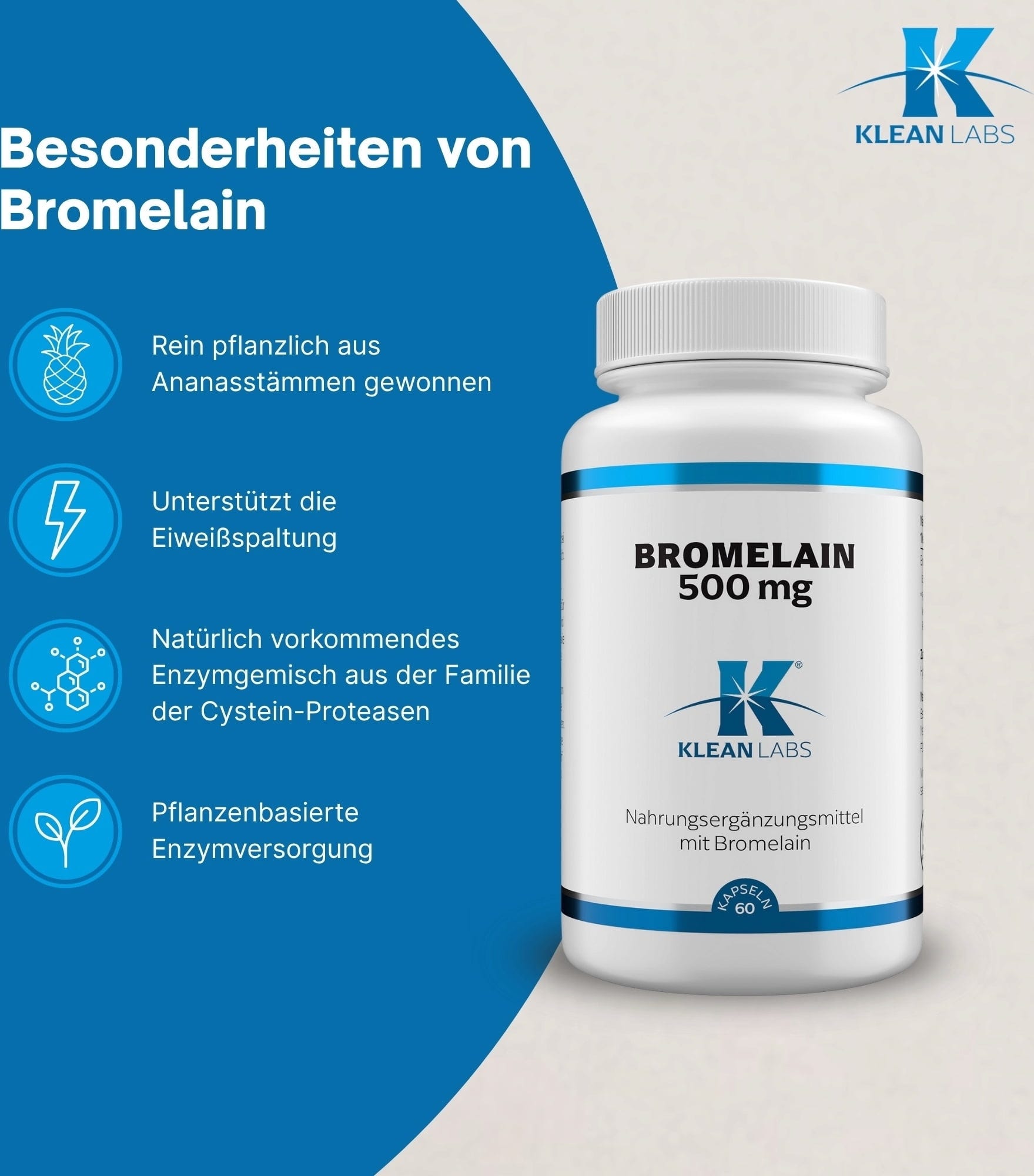 Bromelain se pridobiva iz spodnjega stebla rastline ananasa in je sestavljen iz dveh encimov, ki cepita proteine. Prehransko dopolnilo vsebuje 500 mg bromelaina na kapsulo, je 100-odstotno vegansko in brez GSO.