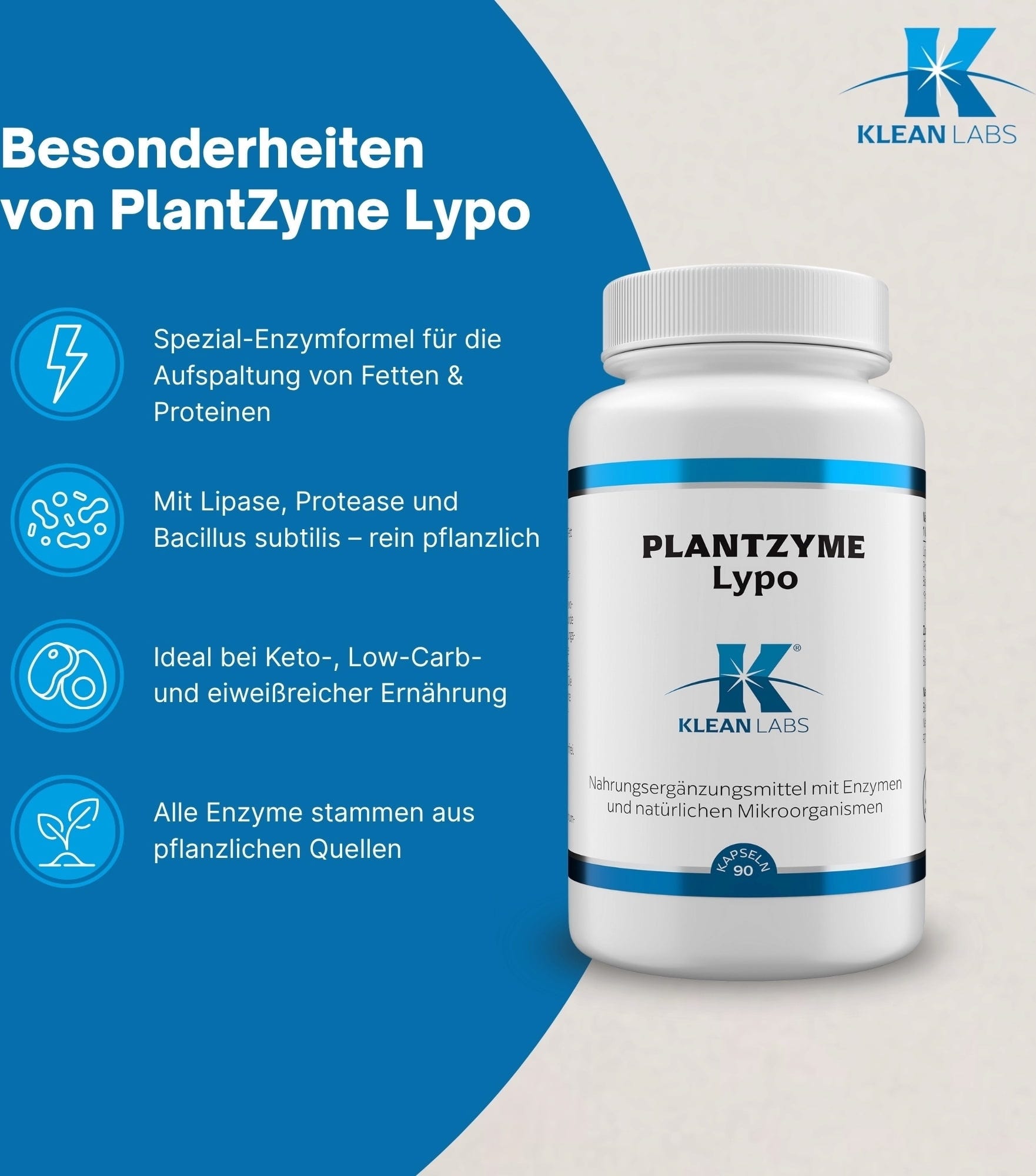 PlantZyme Lypo KLEAN LABS je ciljno usmerjena encimska formula z rastlinsko lipazo, proteazo in Bacillus subtilis. Ta kombinacija je še posebej primerna za obroke z višjo vsebnostjo maščob ali beljakovin. Kapsule so pH-stabilne, veganske in brez umetnih dodatkov.