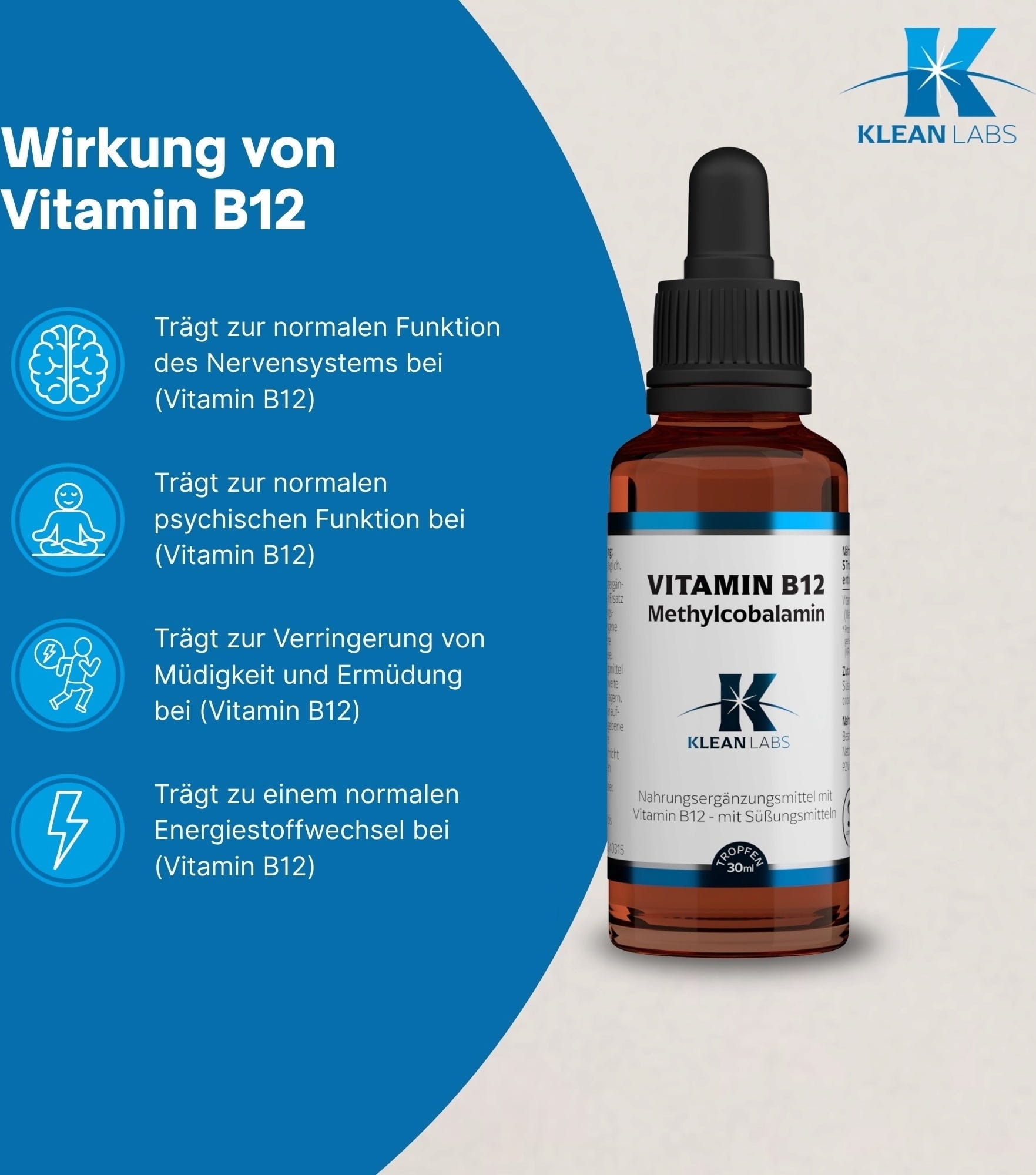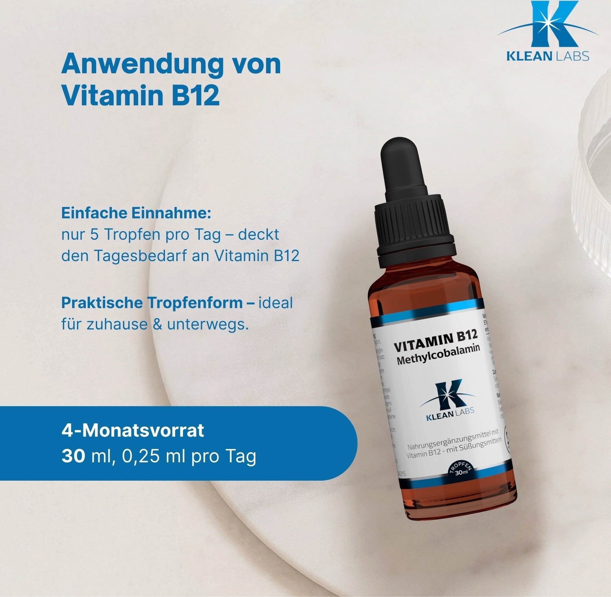 Tekoči metilkobalamin zagotavlja 1000 mcg vitamina B12 z visoko biološko uporabnostjo. Zaradi tekoče oblike lahko vitamin zaužijete hitro in enostavno.
