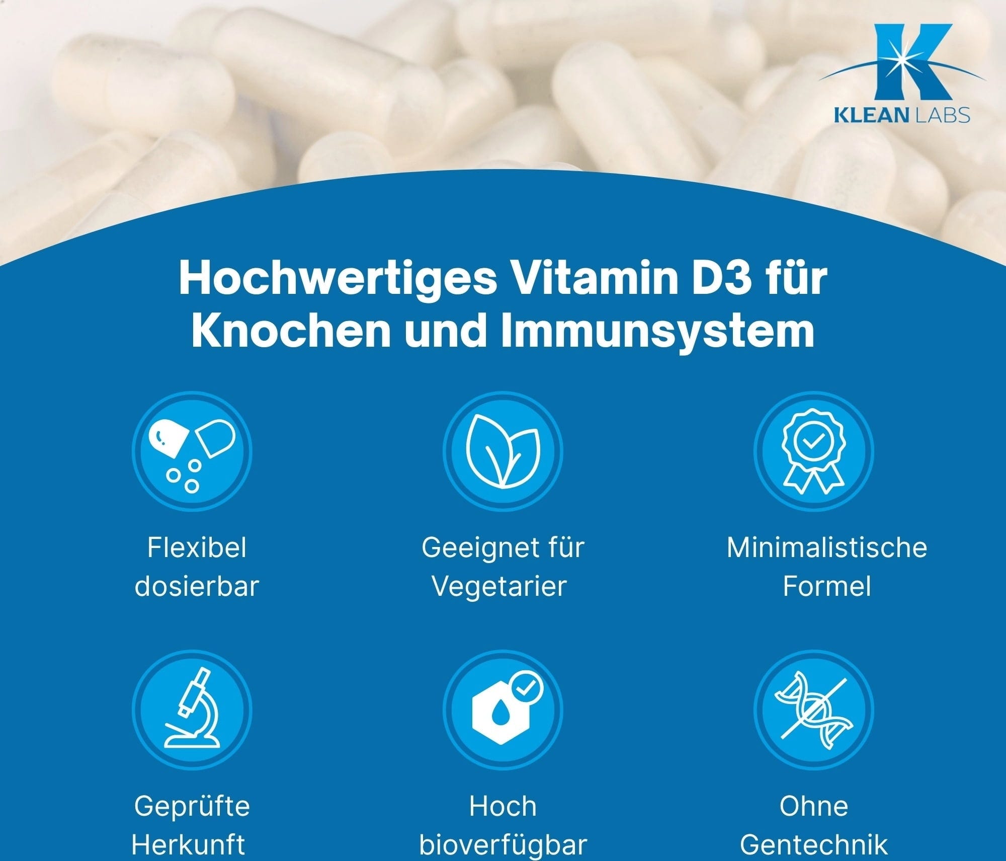 Vitamin D3 v obliki monovitamina in v tekoči obliki znamke KLEAN LABS. Tekočina brez sladkorja vsebuje 1000 IU naravnega vitamina D3.