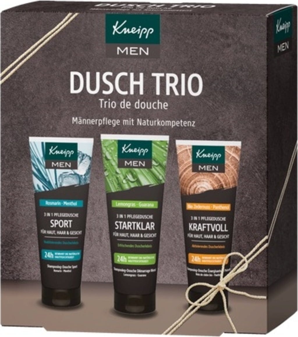 Kneipp MEN tuš trio vsebuje tri različne prhe 3 v 1 za telo, lase in obraz v praktični preizkusni velikosti. Negovalne formule nežno čistijo in podpirajo prijeten občutek pri prhanju, kar je idealno za vsakodnevni začetek dneva ali po športu.