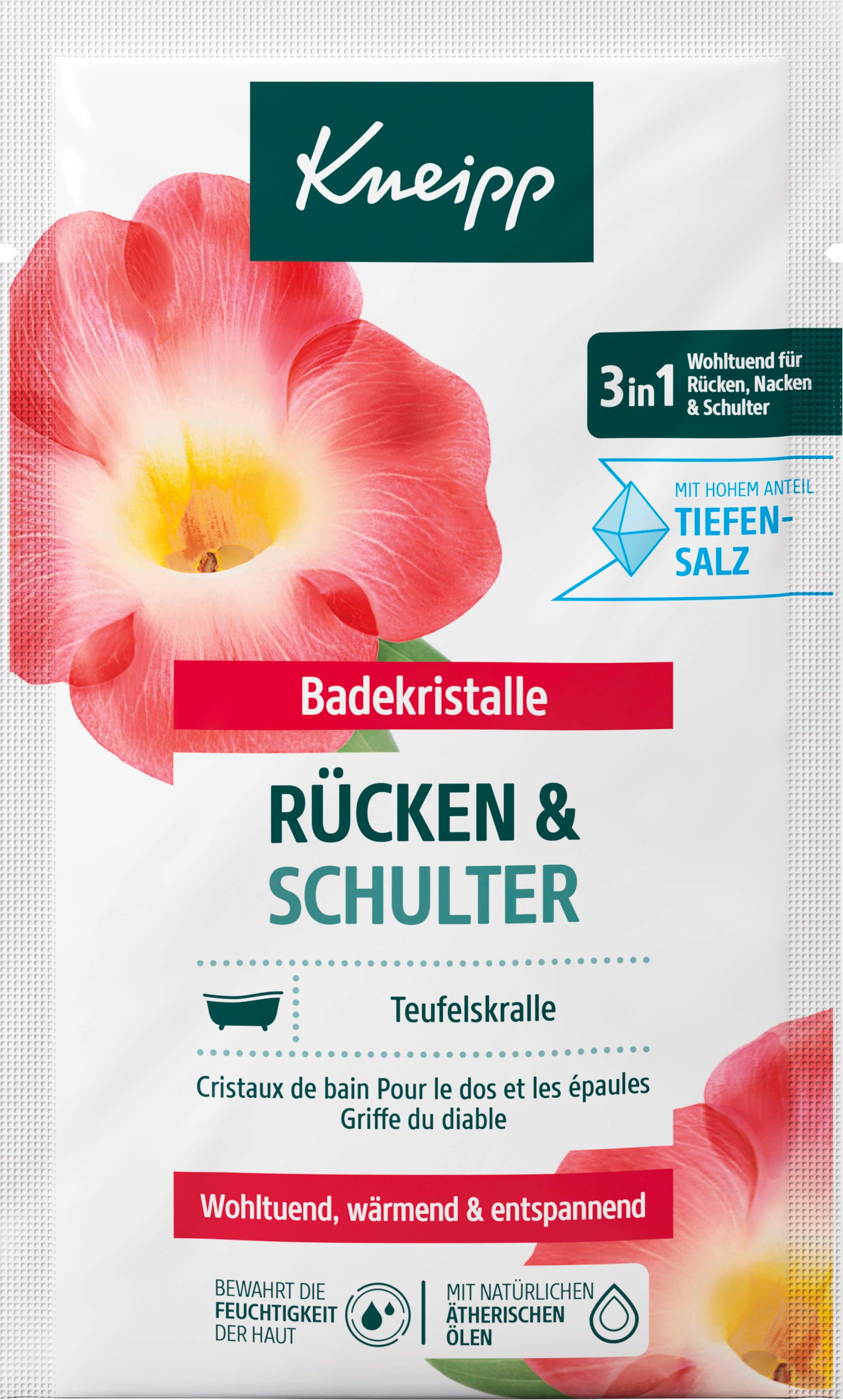 Kneippovi kristali za kopel za hrbet in ramena oddajajo aromatičen zeliščni vonj iz naravnih eteričnih olj. Kristali za kopel vsebujejo dragocen izvleček hudičevega kremplja in zeliščno, pikantno eterično olje kajeputa. Kristali se popolnoma raztopijo, ko se kopel spusti.