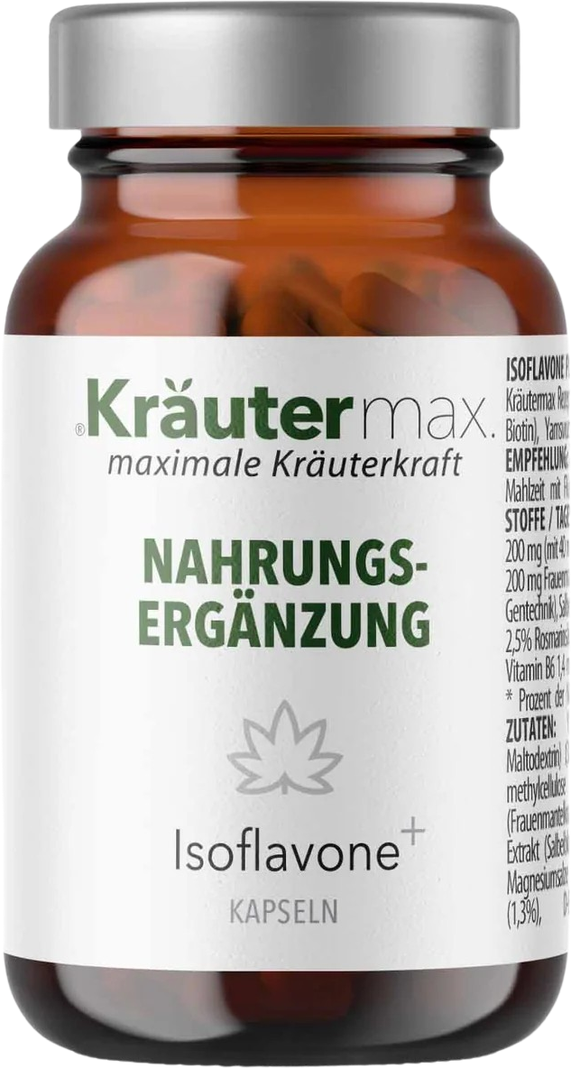 Isoflavone+ kapsule znamke Kräutermax so prehransko dopolnilo s specifično kombinacijo vitaminov in rastlinskih izvlečkov. Kapsule vsebujejo originalno formulo znamke Kräutermax z izoflavoni soje brez gensko spremenjenih organizmov, izvlečkom korenine yam z diosgeninom, izvlečkom plahtice in izvlečkom listov žajblja.