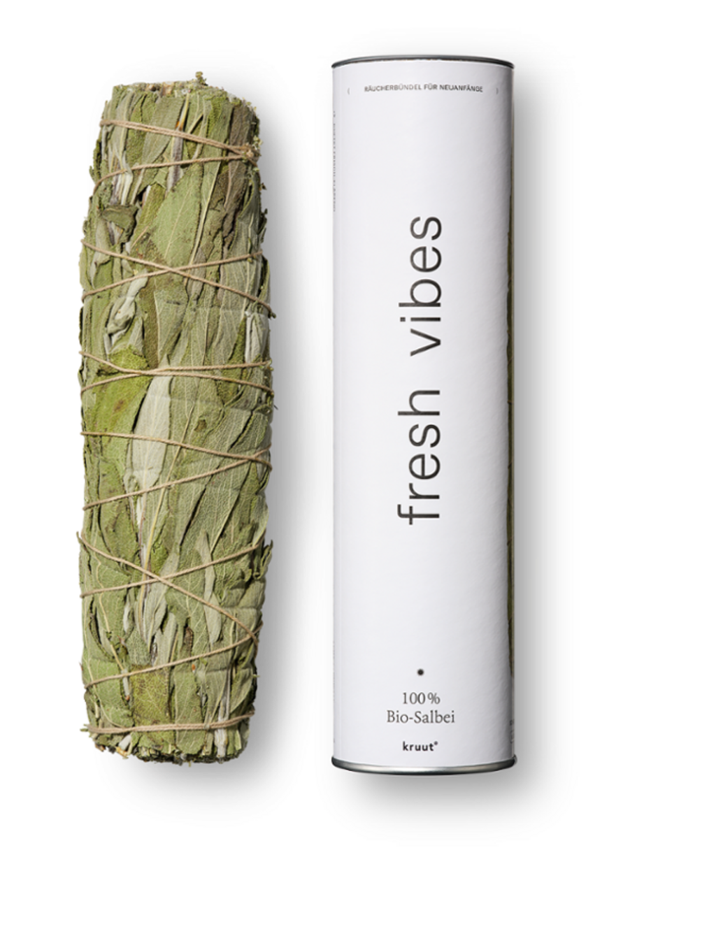 Fresh Vibes znamke kruut je kadilni snop iz visokokakovostnega, pristnega, bio pridelanega žajblja. Pri gorenju žajbelj sprosti značilen, zeliščno-smolnat vonj. Vsak snop je ročno vezan in nežno posušen, da se ohrani čistost rastlin.