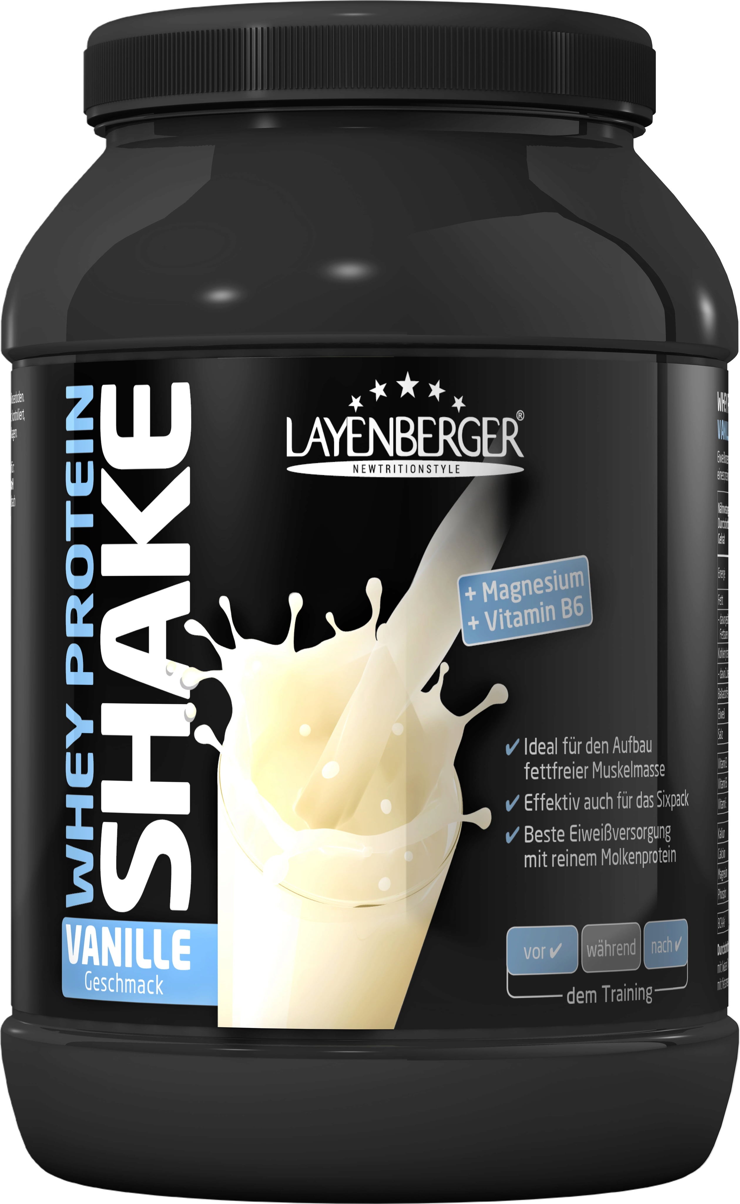 Layenberger Whey Protein Shake je klasičen prašek sirotkinih proteinov z okusom vanilije, ki vam pomaga prilagodljivo doseči vnos proteinov in pripravljati preprosto mešane napitke. Sestavljen je iz kombinacije koncentrata in izolata sirotkinih proteinov, kar ima za posledico visoko vsebnost proteinov. Ena porcija (cca. 25 g praška v vodi) vsebuje 18 g proteinov in prijeten okus vanilije. Izdelek je še obogaten z dodanimi aminokislinami BCAA, magnezijem in vitaminom B6. Njegova optimizirana topnost omogoča, da prašek gladko in brez grudic zmešate tako v vodi kot v mleku z nizko vsebnostjo maščob.