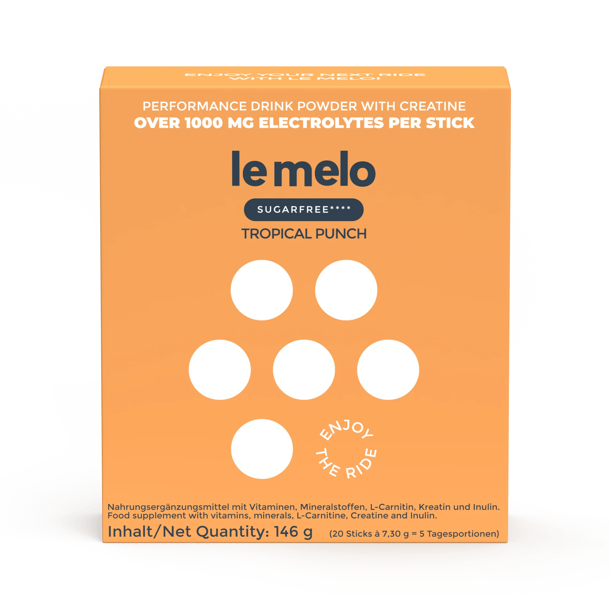 inulin iz korenine cikorije (Cichorium intybus) izvleček, citronska kislina[1], kreatin monohidrat, aroma (pomarančna-marakuja), natrijev klorid, Calciumsalze der Orthophosphorsäure, kalijev citrat, L-Carnitin, dolomit (kalcijev-magnezijev-karbonat), kalcijev L-askorbat, magnezijev citrat, kalijev klorid, magnezijev oksid, sukraloza[2], železov glukonat, cinkov citrat, Calcium-D-Pantothenat, holekalciferol, piridoksin hidroklorid, kromov pikolinat