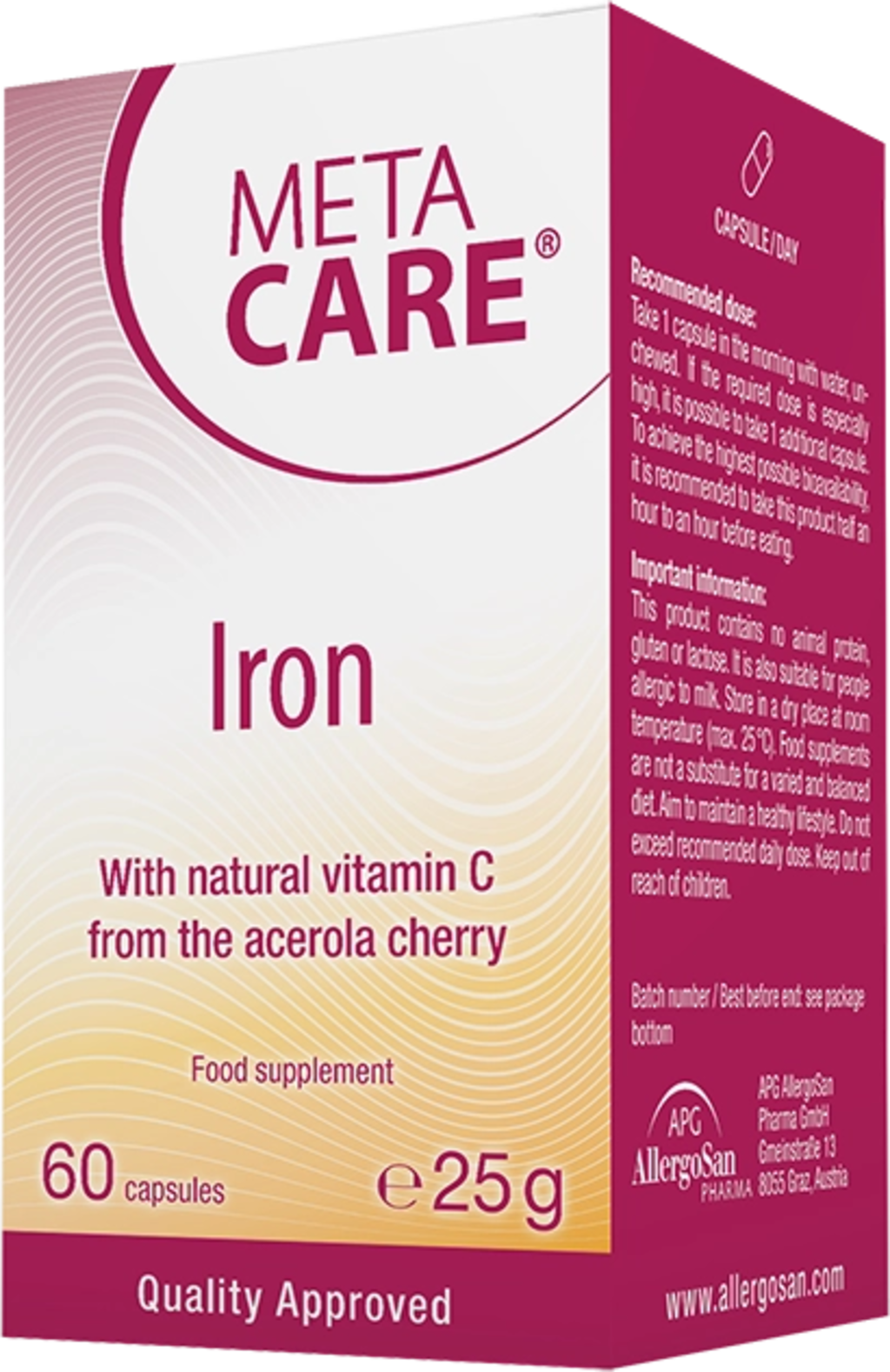Kapsule železa znamke META-CARE® vsebujejo železo iz izvlečka listov curryja in železovega bisglicinata. Kapsule vsebujejo tudi vitamin C iz češnje acerola, vitamin B12 in folno kislino. Kapsule so veganske in brez GSO.