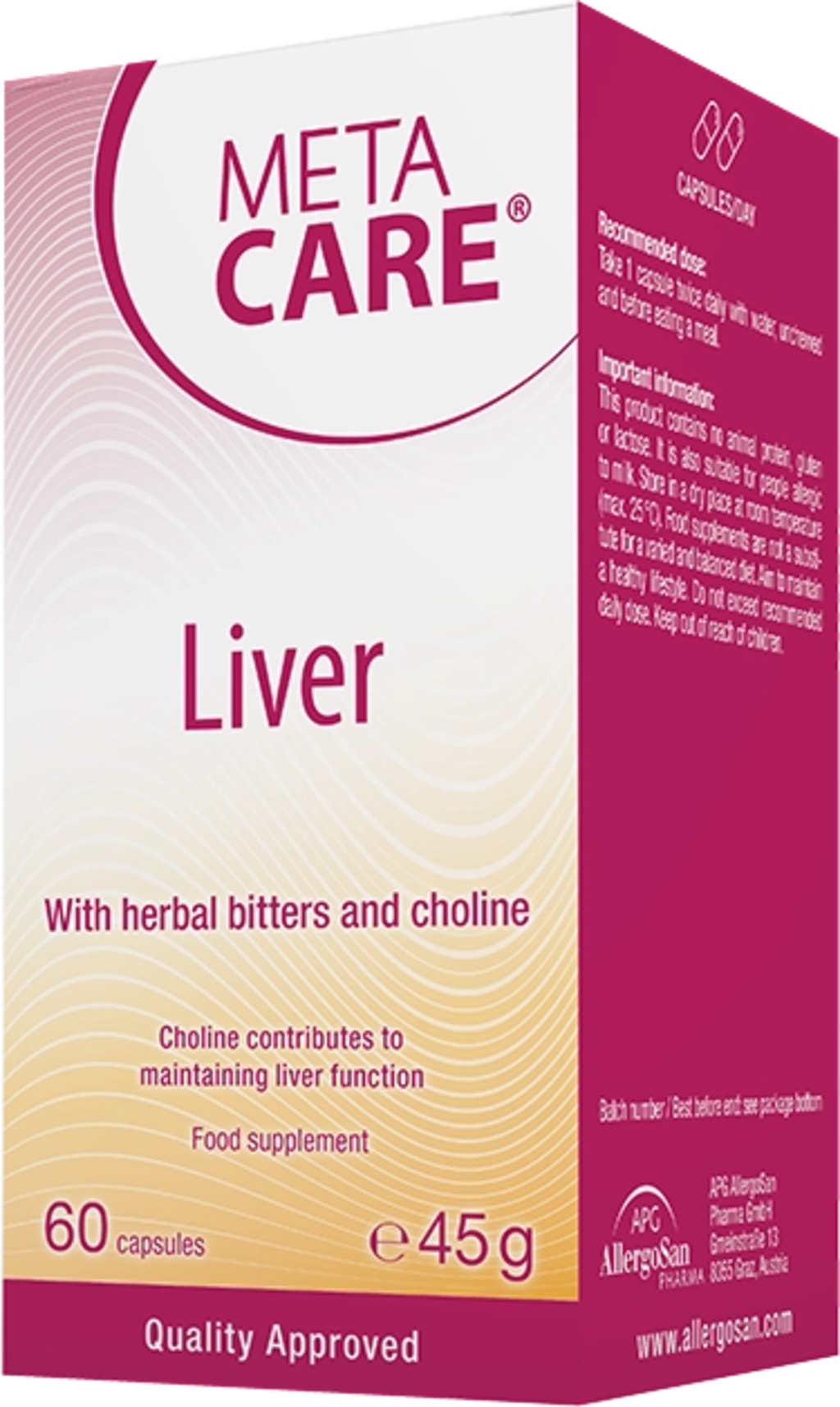 Veganske kapsule Liver znamke META-CARE® vsebujejo grenke snovi iz pegastega badlja, regrata in artičoke. Obogatene so tudi s hrenom, ki vsebuje veliko gorčičnih olj, in holinom. Kapsule ne vsebujejo GSO, glutena in laktoze.