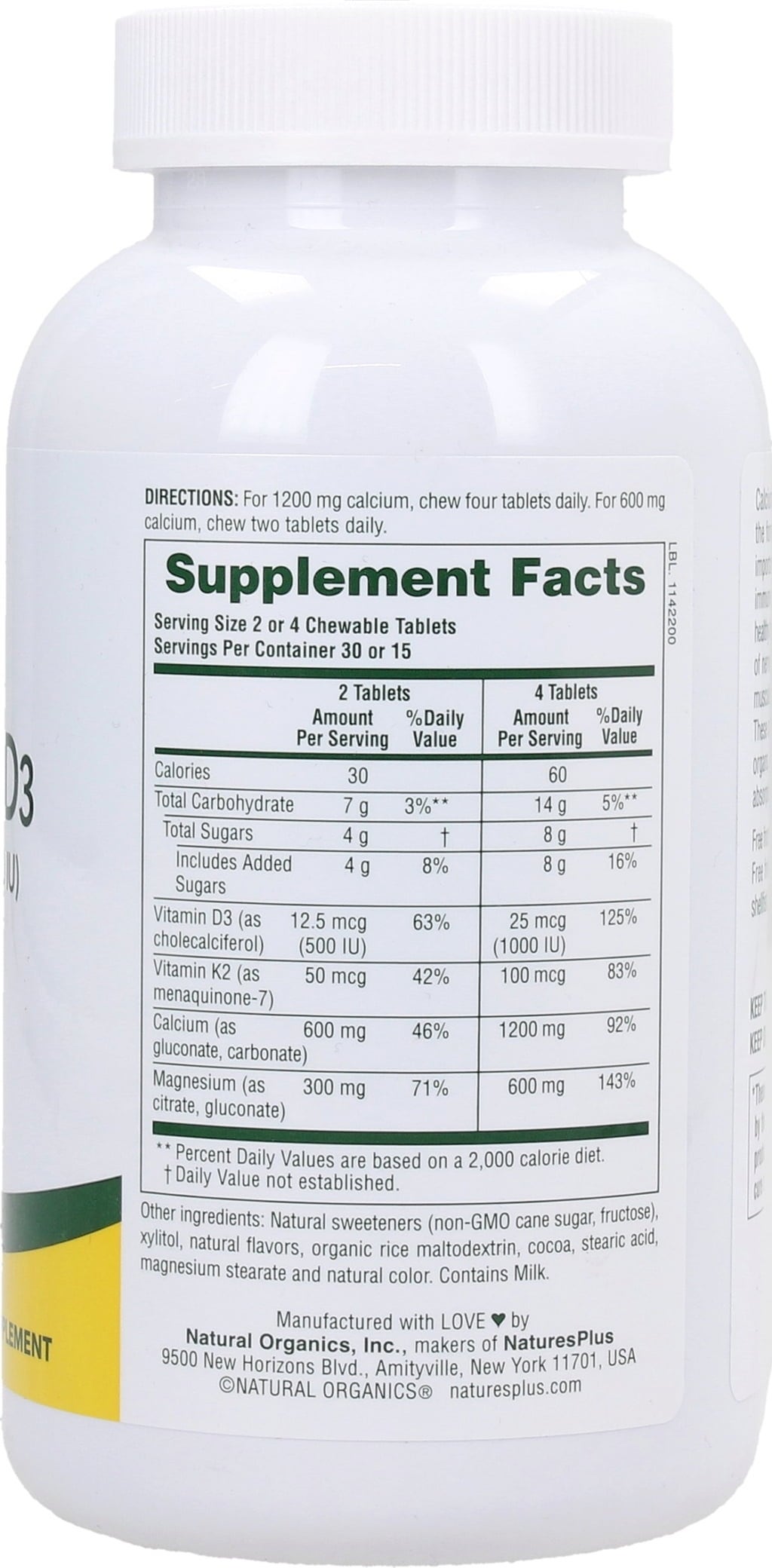 Nature's Plus Kalcij/Magnezij/Vitamin D3 z Vitaminom K2 žvečilne tablete, okus čokolada (60 žveč. tabl.)