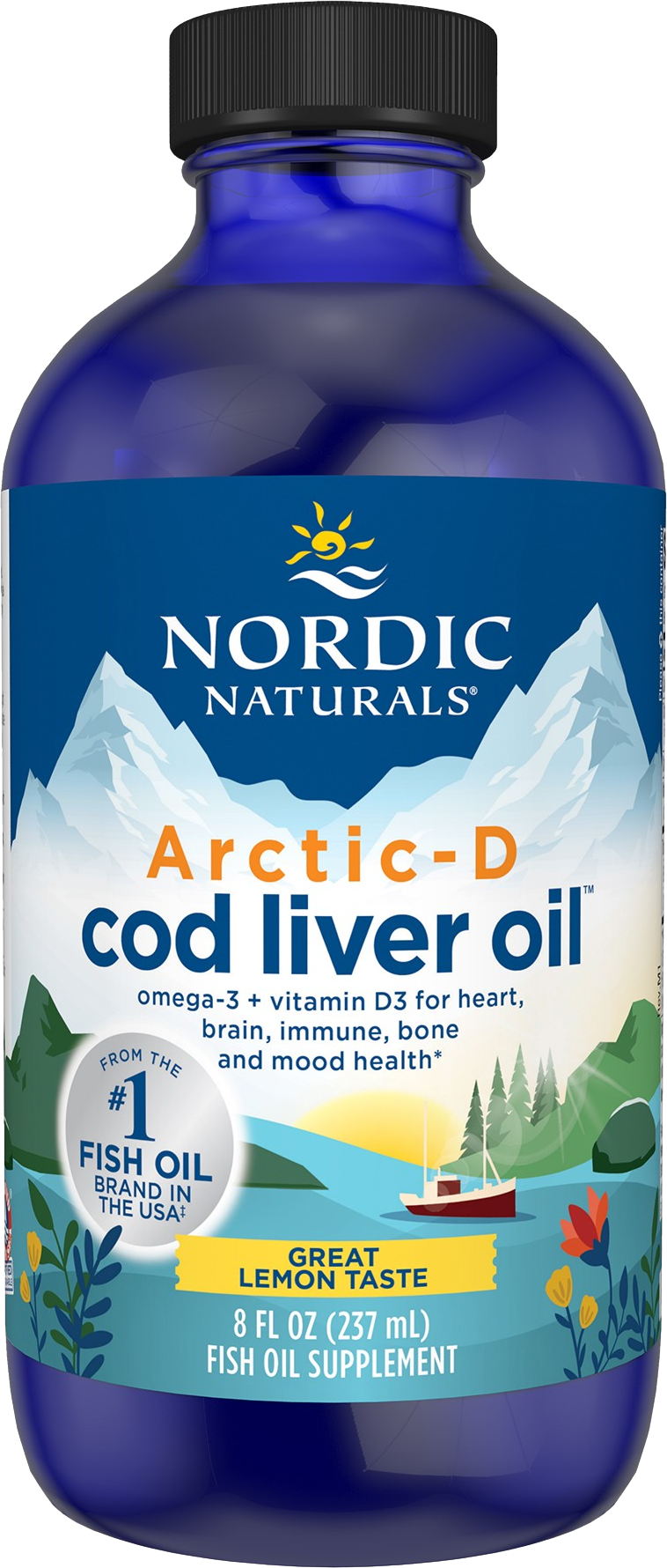 Arctic-D Cod Liver Oil Lemon znamke Nordic Naturals ponuja visokokakovostno olje iz jeter arktične trske. Ta vrsta ribe ima še posebej visoko vsebnost omega-3 maščobnih kislin in vsebuje EPA in DHA. Osvežilna limona zagotavlja prijeten okus. Obogateno je z vitaminom D3.