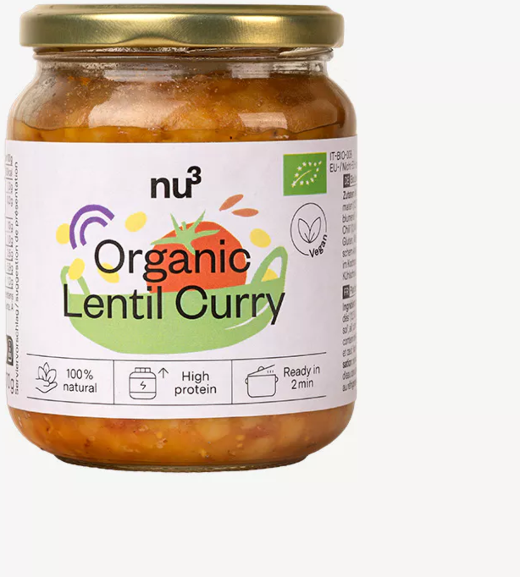 Bio Lentil Curry znamke nu3 je curry omaka iz rumene leče ter prinaša pristen indijski okus neposredno na vaš krožnik – hitro, enostavno in bio. Osnovo tvorijo rumena leča, paradižnik in čebula, obogateni s kurkumo, čilijem in drugimi začimbami. Tako nastane kremasta curry omaka iz leče brez umetnih dodatkov, ki je popolna za hitre obroke kadar koli v dnevu.
