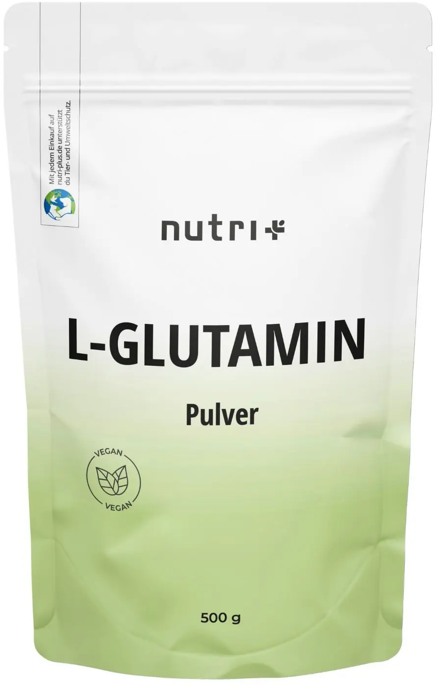 L-glutamin znamke nutri+ je proizveden s fermentacijo koruze, tako da nastane izjemno fin prah popolnoma rastlinskega izvora. Je 100% veganski, brez glutena, soje in GSO. Poleg tega ne vsebuje aditivov, kot so barvila, arome in sredstva proti strjevanju.