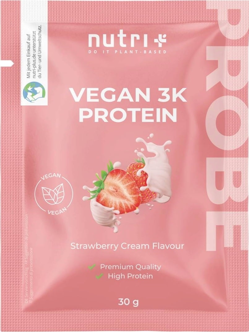 nutri + Vegan 3K Protein Powder, paket za testiranje, Strawberry-Cream (30 g)