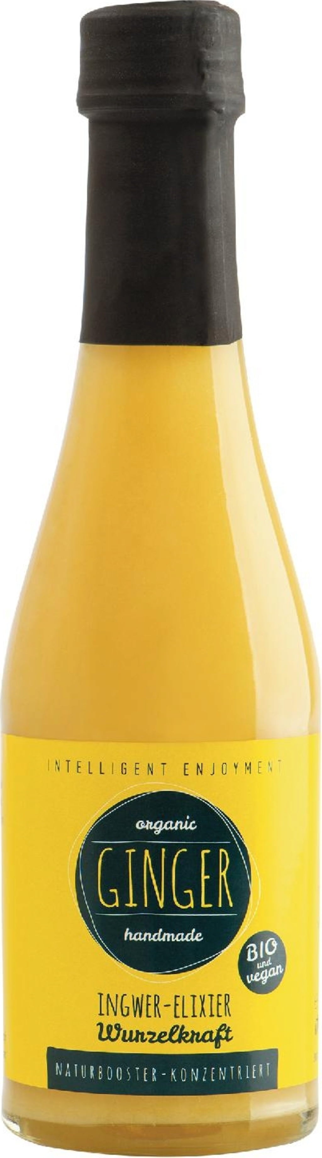 Naravni eliksir ingverja združuje svežo korenino ingverja z osvežilnimi sadeži, kot so limete, limone, pomaranče in jabolka. Konopljin sok, žajbelj in listi brina dopolnjujejo fin okus, surovi trsni sladkor pa daje pijači optimalno sladkost.