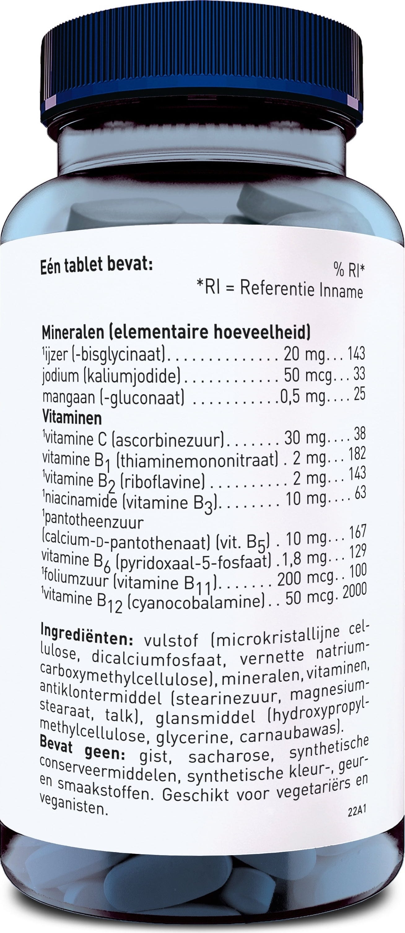 polnilo (mikrokristalna celuloza, Kalcijevi fosfati, Natrijevkarboksilmetil celuloza), železov bisglicinat, sproščevalno sredstvo (Jedilne maščobne kisline, magnezijeve soli iz jedilnih maščobnih kislin, Talkum), Prevleka (hidroksietilmetilceluloza, glicerin, karnauba vosek), L-askorbinska kislina, niacinamid, vitamin B5 (kalcijev-D-pantotenat), manganov glukonat, tiamin mononitrat, riboflavin, piridoksal-5-fosfat, bakrov glukonat, folna kislina, kalijev jodid, cianokobalamin