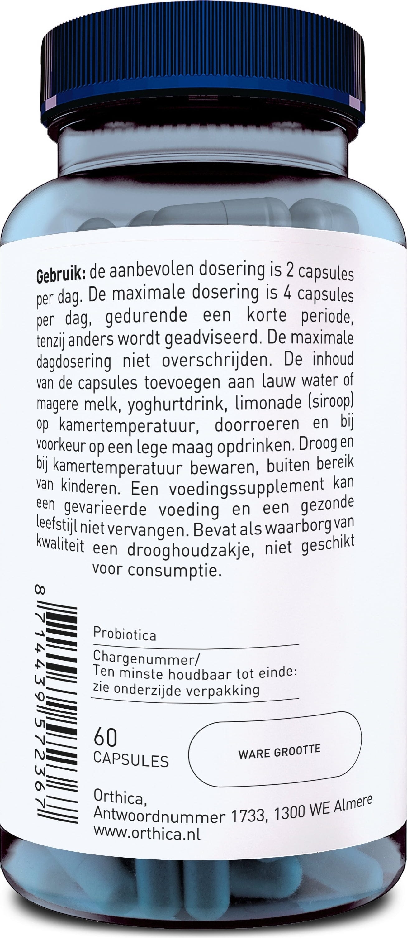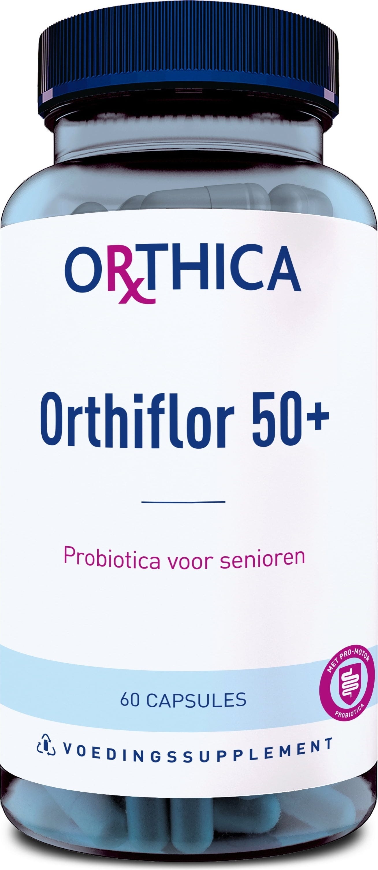 Orthica Orthiflor 50+ zagotavlja usklajen izbor šestih različnih kultur mlečnokislinskih bakterij, ki skupaj vsebujejo 2 milijardi enot, ki tvorijo kolonije (CFU), na priporočeni dnevni odmerek. Formula je dopolnjena s prebiotičnimi rastlinskimi vlakninami, kot sta inulin in fruktooligosaharidi (FOS), ki delujejo kot vir hranil za mikrobne kulture. Recept je namenjen osebam, starim 50 let in več.