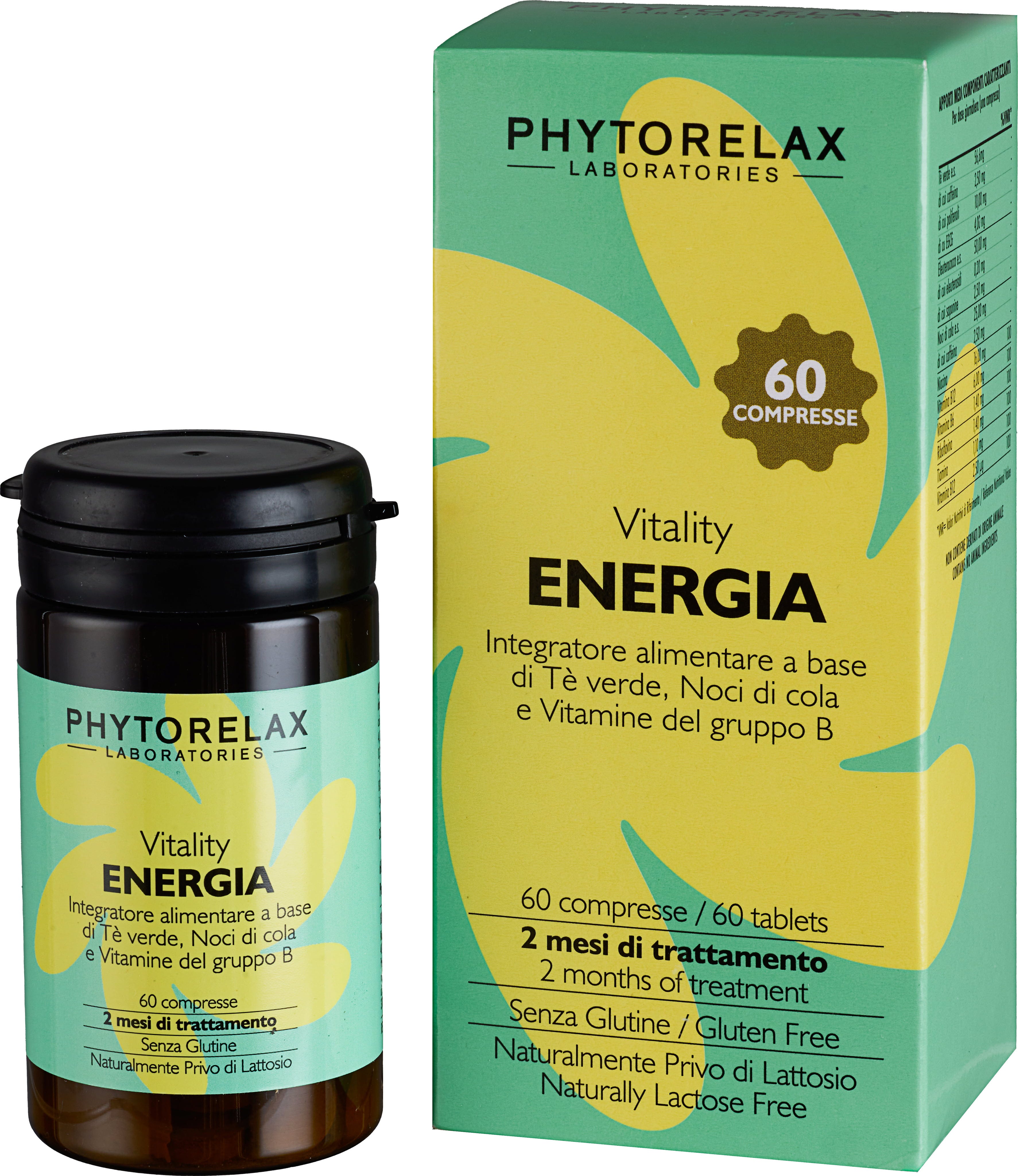 Vitality - Energija znamke Phytorelax je prehransko dopolnilo s skrbno zasnovano sestavo, ki temelji na vitaminih skupine B, izvlečku zelenega čaja, izvlečku sibirskega ginsenga (oz. elevterokoka) in izvlečku kola oreščka. Formulacija je na voljo v priročni tableti, ki jo zaužijete enkrat na dan in jo zlahka vključite v vsakdanje življenje. Seznam sestavin združuje klasične vitamine skupine B z znanimi rastlinskimi izvlečki brez odvečnih dodatkov ter ne vsebuje glutena in laktoze. Rezultat je uravnotežena sestava, idealna za tiste, ki želijo zavestno in dobro organizirano izbrati prehransko dopolnilo.